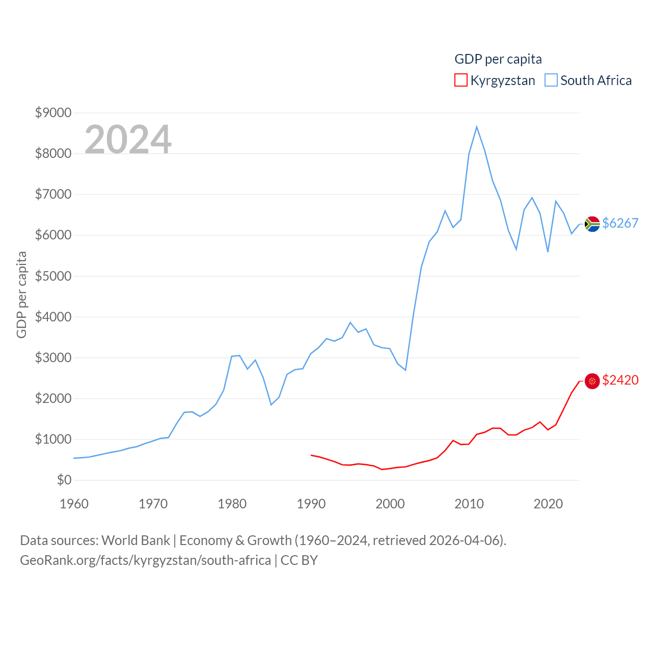 By GDP, Kyrgyzstan ranks 135/197 ($17.5B) and South Africa ranks 40/197 ($401B). By GDP per capita, Kyrgyzstan ranks 150/197 ($2,420), while South Africa ranks 111/197 ($6,267).