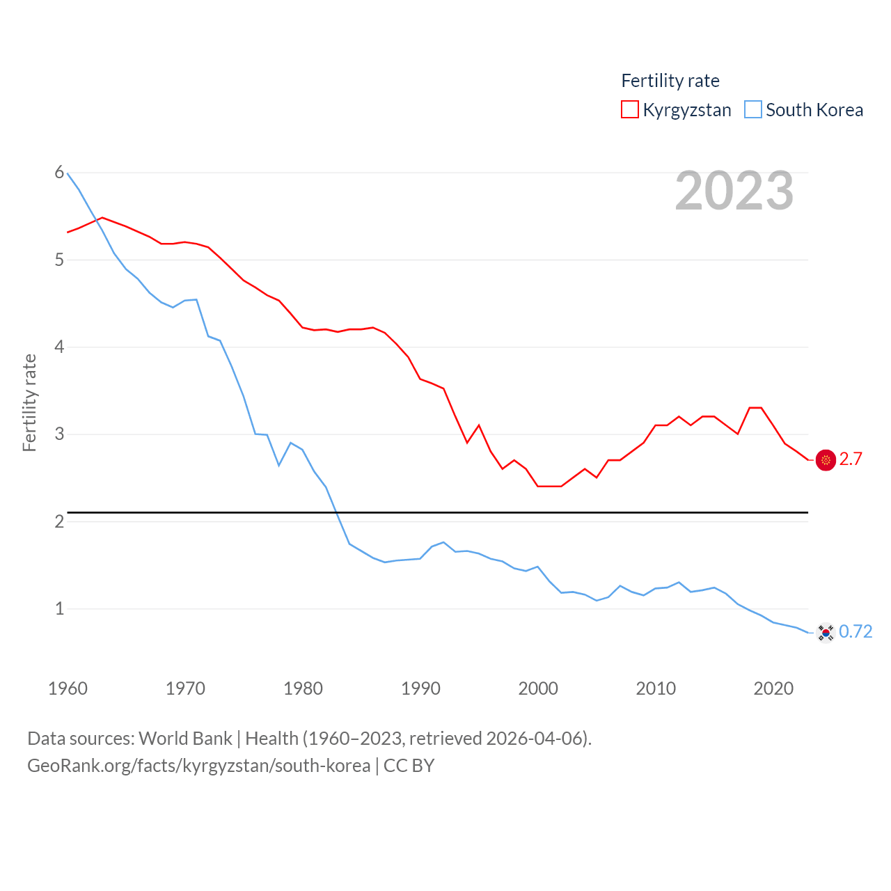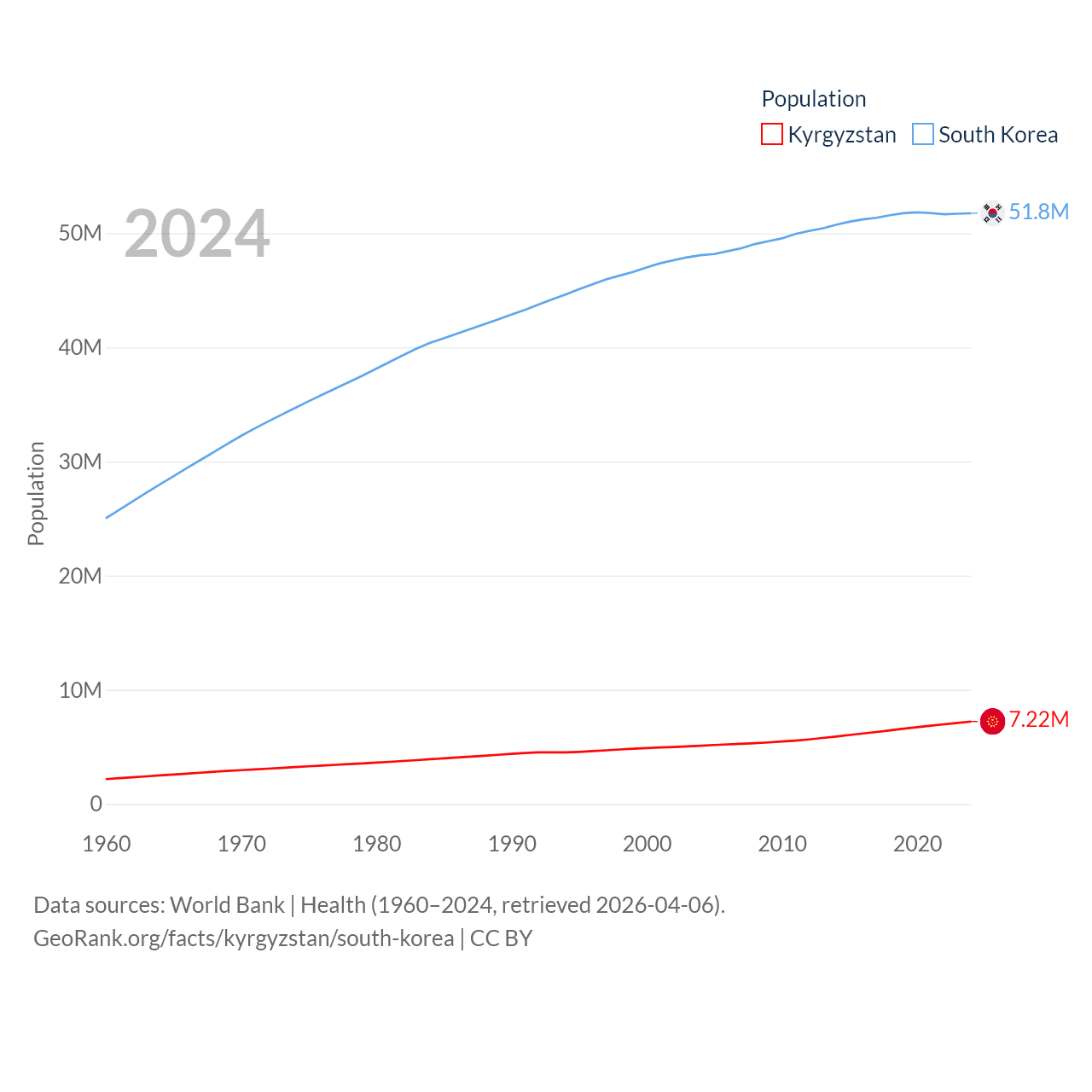 Kyrgyzstan has a population of 7.22M (ranked 106/197), compared with 51.8M in South Korea (ranked 29/197). Kyrgyzstan's land area is 74,054 sq mi versus 37,684 sq mi for South Korea (ranked 86th vs. 105th).