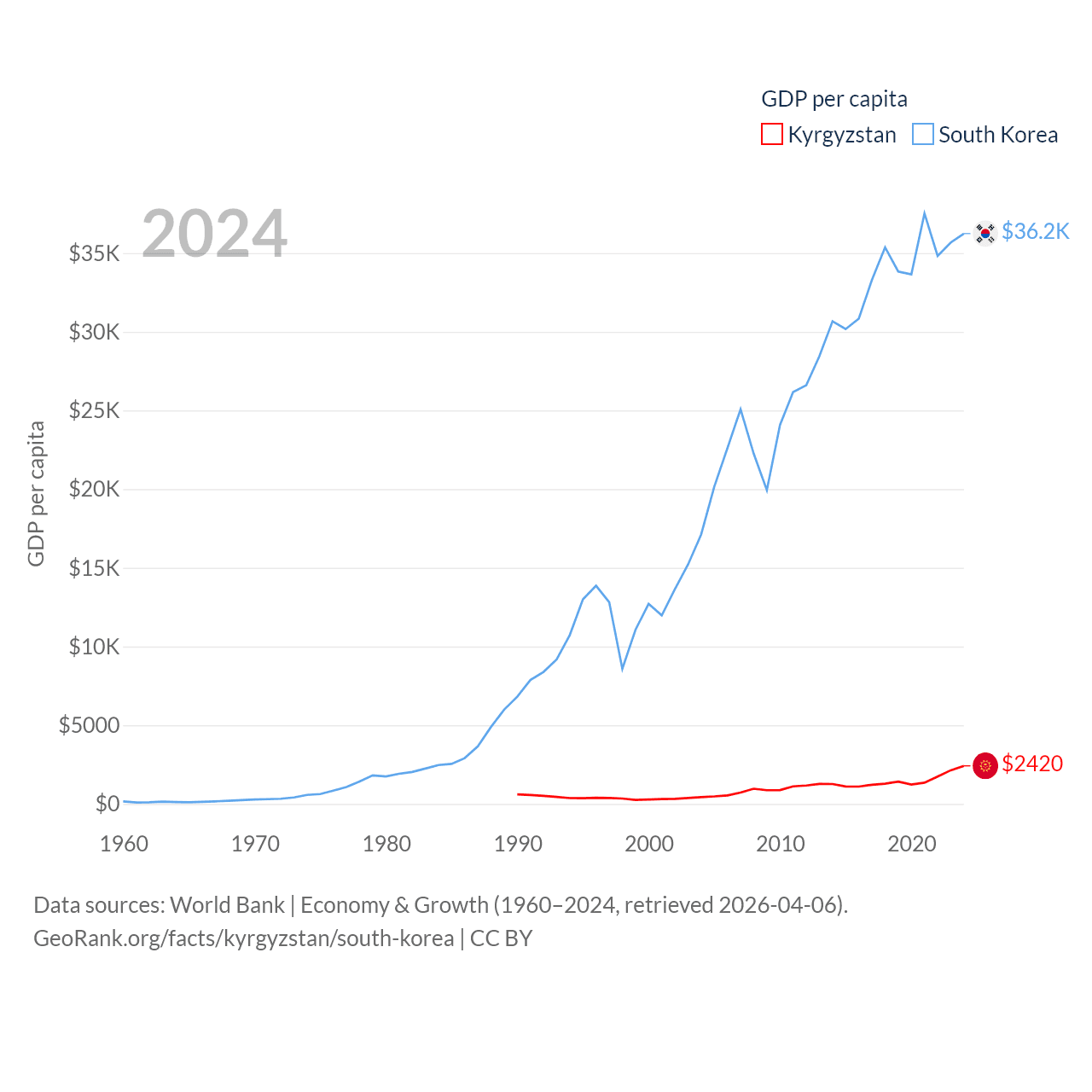 By GDP, Kyrgyzstan ranks 135/197 ($17.5B) and South Korea ranks 12/197 ($1.88T). By GDP per capita, Kyrgyzstan ranks 150/197 ($2,420), while South Korea ranks 31/197 ($36,239).