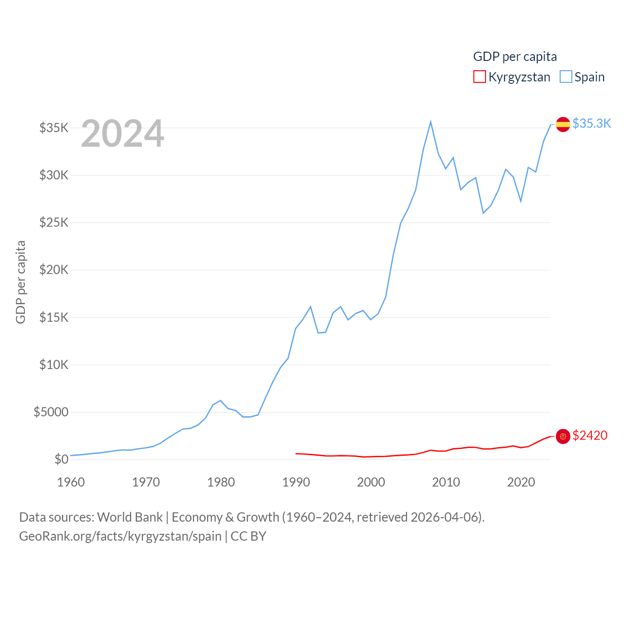 By GDP, Kyrgyzstan ranks 135/197 ($17.5B) and Spain ranks 15/197 ($1.73T). By GDP per capita, Kyrgyzstan ranks 150/197 ($2,420), while Spain ranks 32/197 ($35,327).