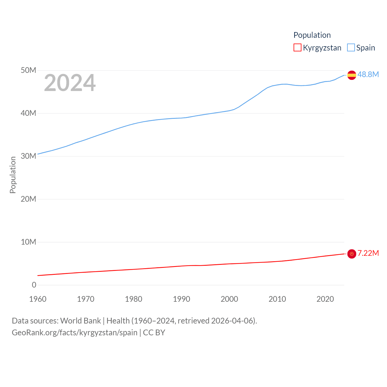 Kyrgyzstan has a population of 7.22M (ranked 106/197), compared with 48.8M in Spain (ranked 32/197). Kyrgyzstan's land area is 74,054 sq mi versus 192,934 sq mi for Spain (ranked 86th vs. 51st).