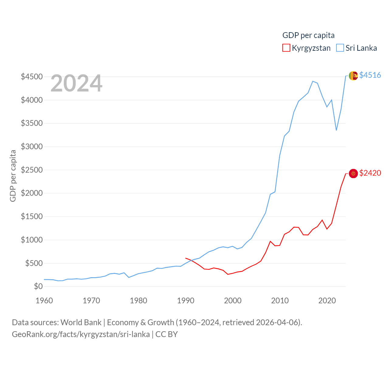 By GDP, Kyrgyzstan ranks 135/197 ($17.5B) and Sri Lanka ranks 72/197 ($99B). By GDP per capita, Kyrgyzstan ranks 150/197 ($2,420), while Sri Lanka ranks 124/197 ($4,516).