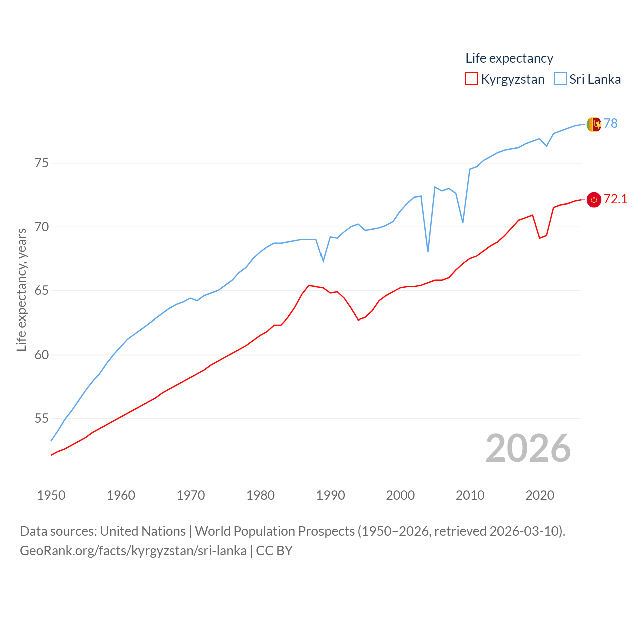 Kyrgyzstan has a population of 7.22M (ranked 106/197), compared with 21.9M in Sri Lanka (ranked 61/197). Kyrgyzstan's land area is 74,054 sq mi versus 23,884 sq mi for Sri Lanka (ranked 86th vs. 122nd).