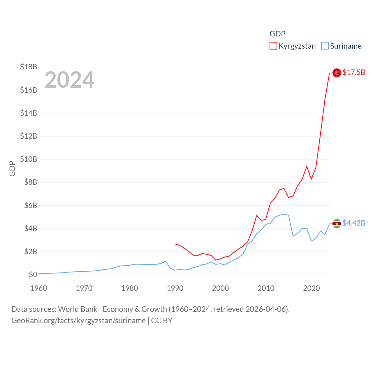 By GDP, Kyrgyzstan ranks 135/197 ($17.5B) and Suriname ranks 164/197 ($4.42B). By GDP per capita, Kyrgyzstan ranks 150/197 ($2,420), while Suriname ranks 102/197 ($6,962).