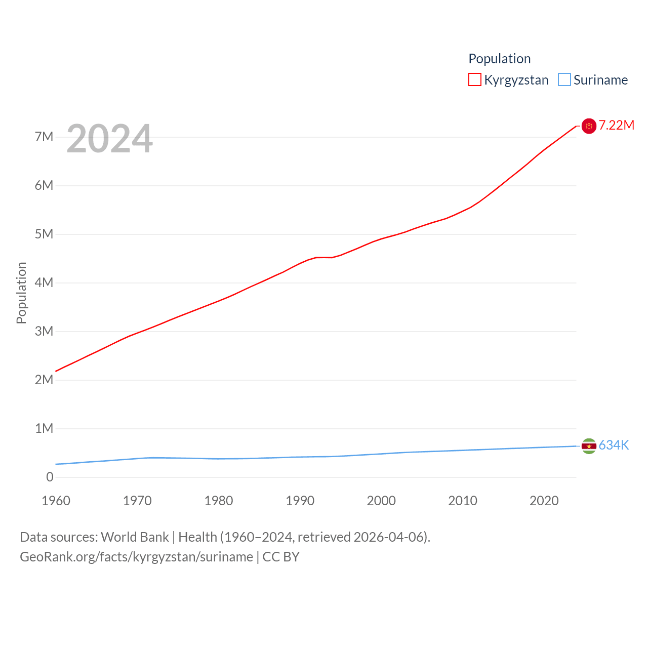 Kyrgyzstan has a population of 7.22M (ranked 106/197), compared with 634K in Suriname (ranked 165/197). Kyrgyzstan's land area is 74,054 sq mi versus 61,972 sq mi for Suriname (ranked 86th vs. 90th).