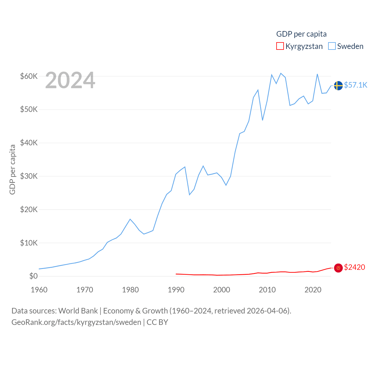 By GDP, Kyrgyzstan ranks 135/197 ($17.5B) and Sweden ranks 26/197 ($604B). By GDP per capita, Kyrgyzstan ranks 150/197 ($2,420), while Sweden ranks 17/197 ($57,117).