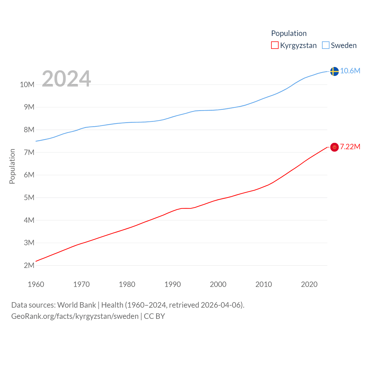 Kyrgyzstan has a population of 7.22M (ranked 106/197), compared with 10.6M in Sweden (ranked 93/197). Kyrgyzstan's land area is 74,054 sq mi versus 157,248 sq mi for Sweden (ranked 86th vs. 58th).