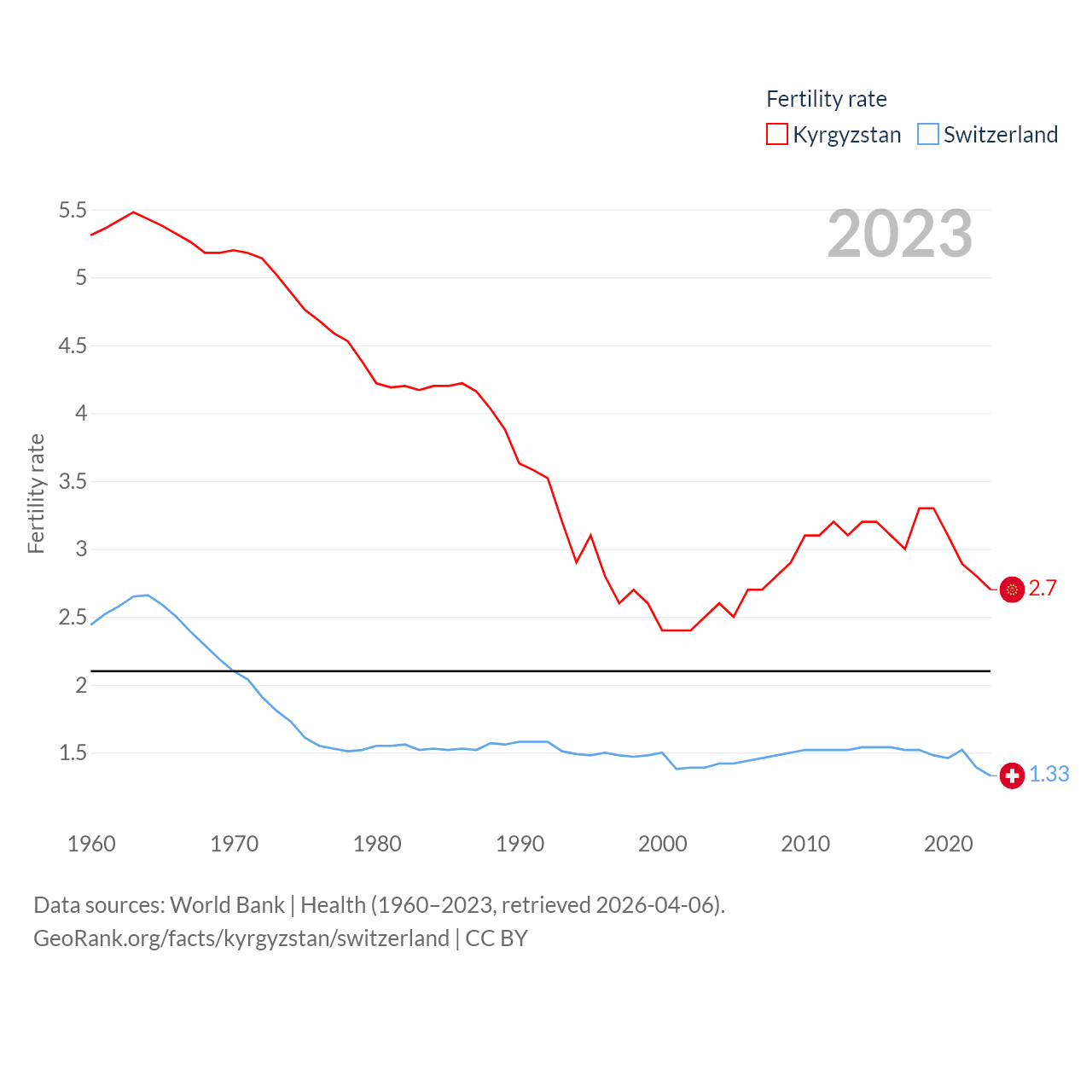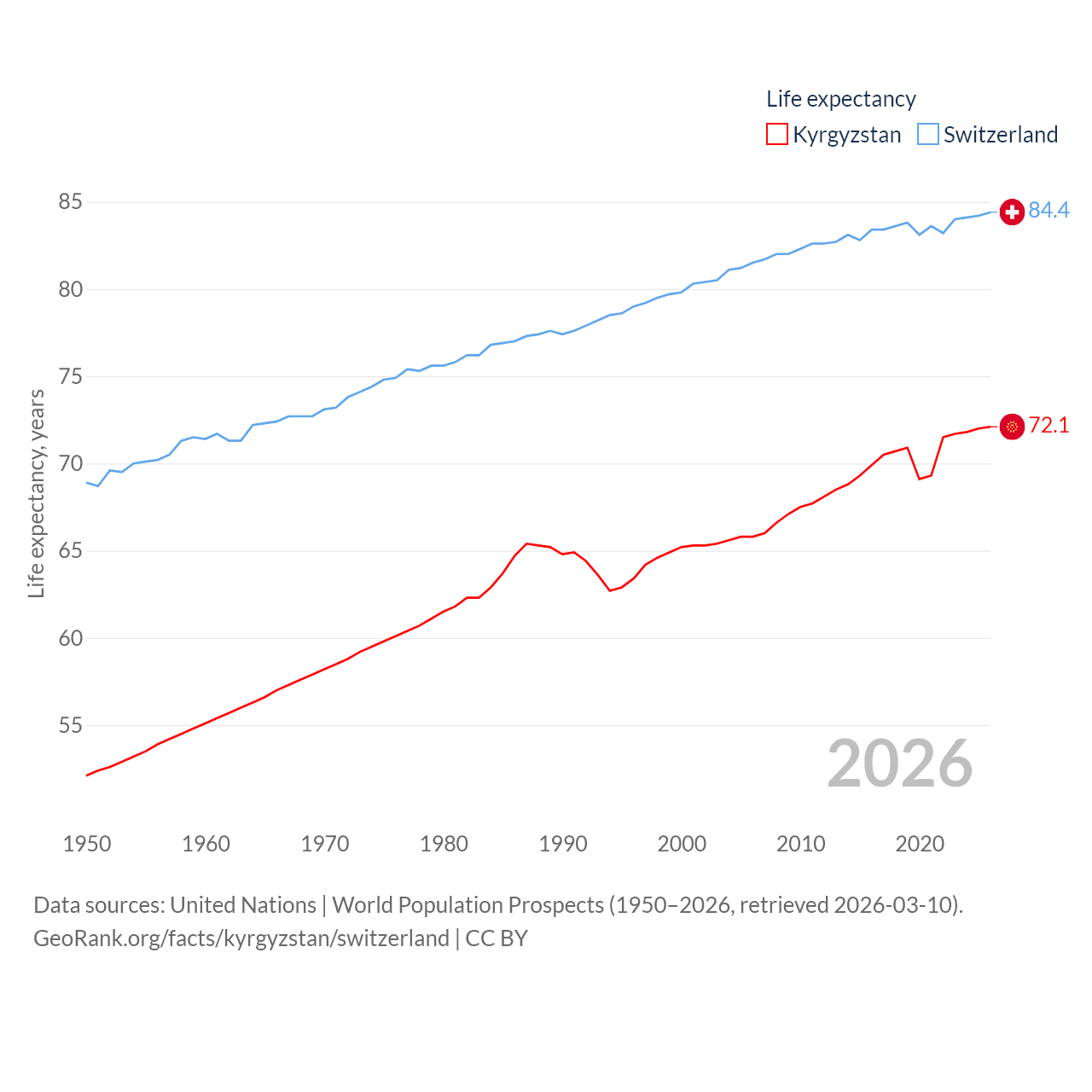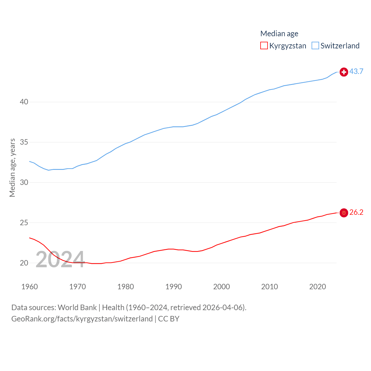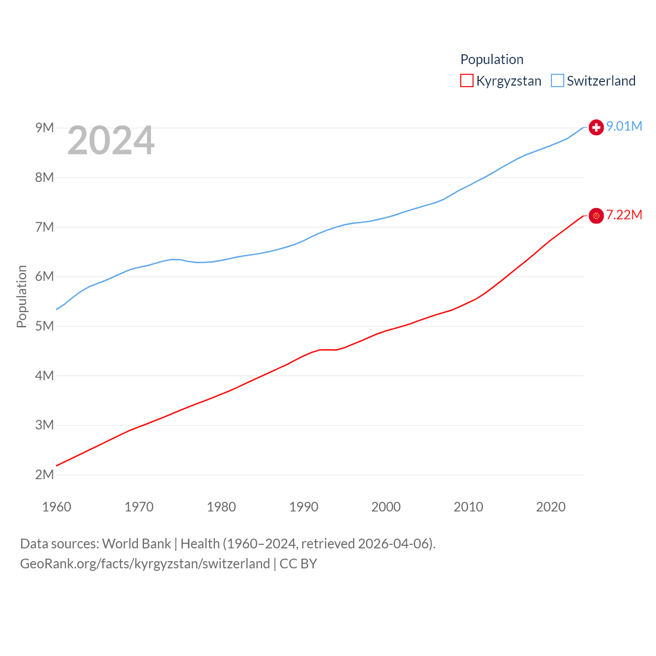 Kyrgyzstan has a population of 7.22M (ranked 106/197), compared with 9.01M in Switzerland (ranked 101/197). Kyrgyzstan's land area is 74,054 sq mi versus 15,255 sq mi for Switzerland (ranked 86th vs. 131st).