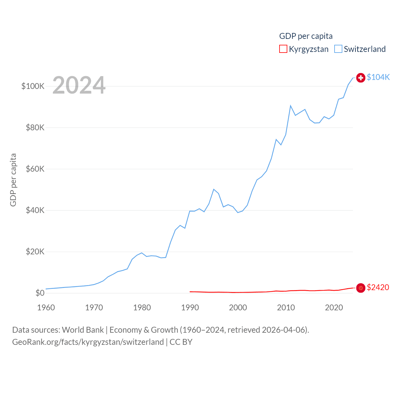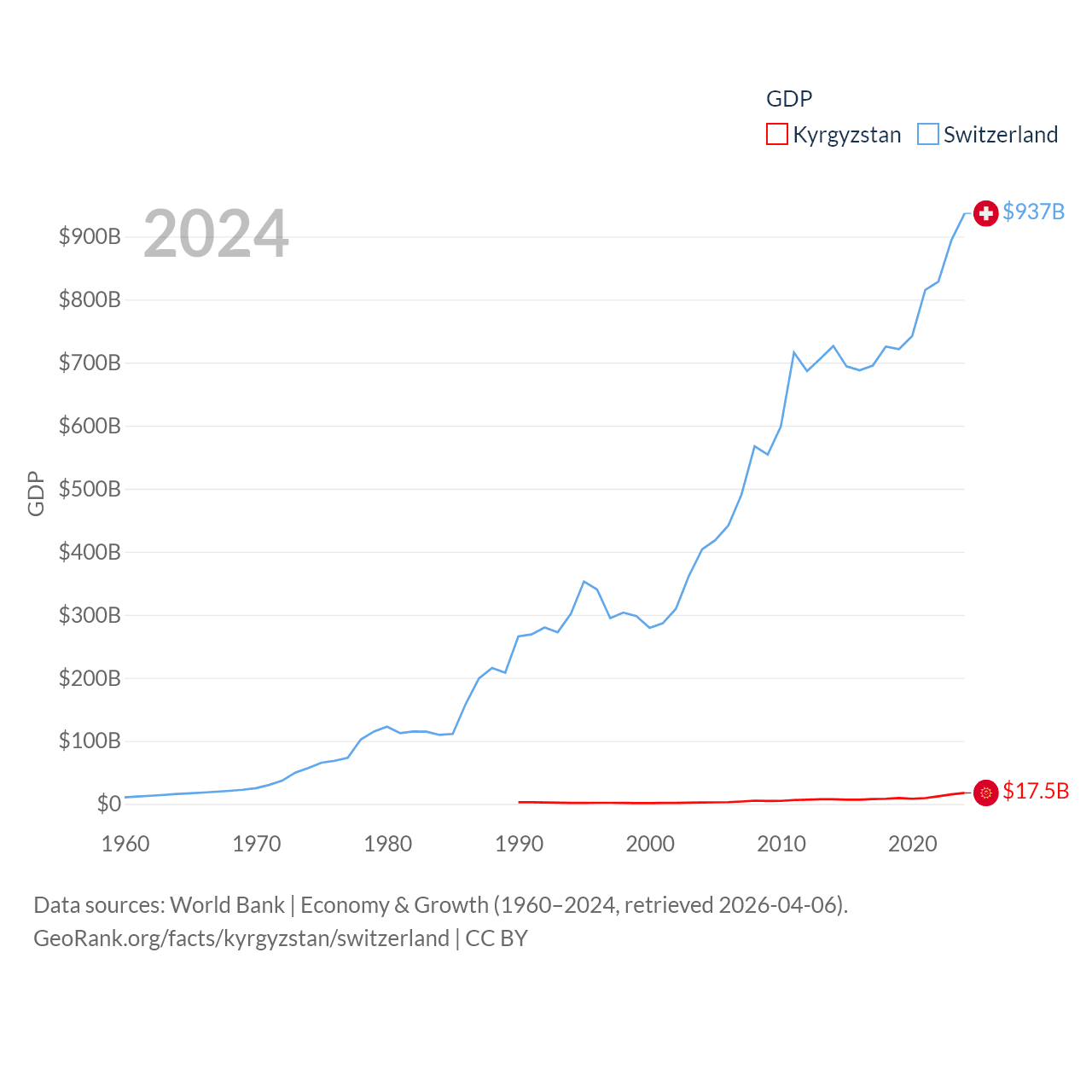 By GDP, Kyrgyzstan ranks 135/197 ($17.5B) and Switzerland ranks 20/197 ($937B). By GDP per capita, Kyrgyzstan ranks 150/197 ($2,420), while Switzerland ranks 5/197 ($103,998).