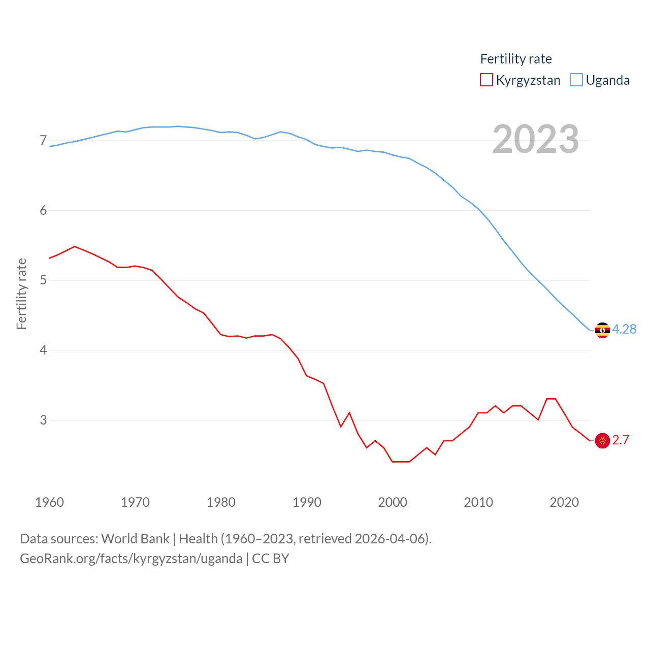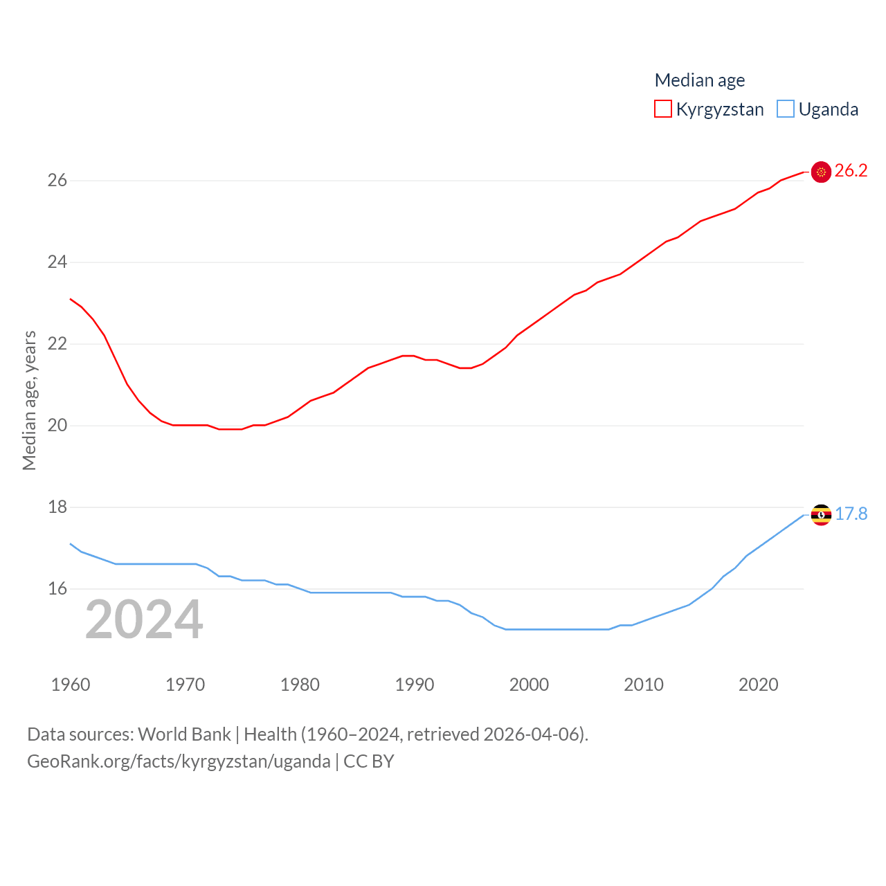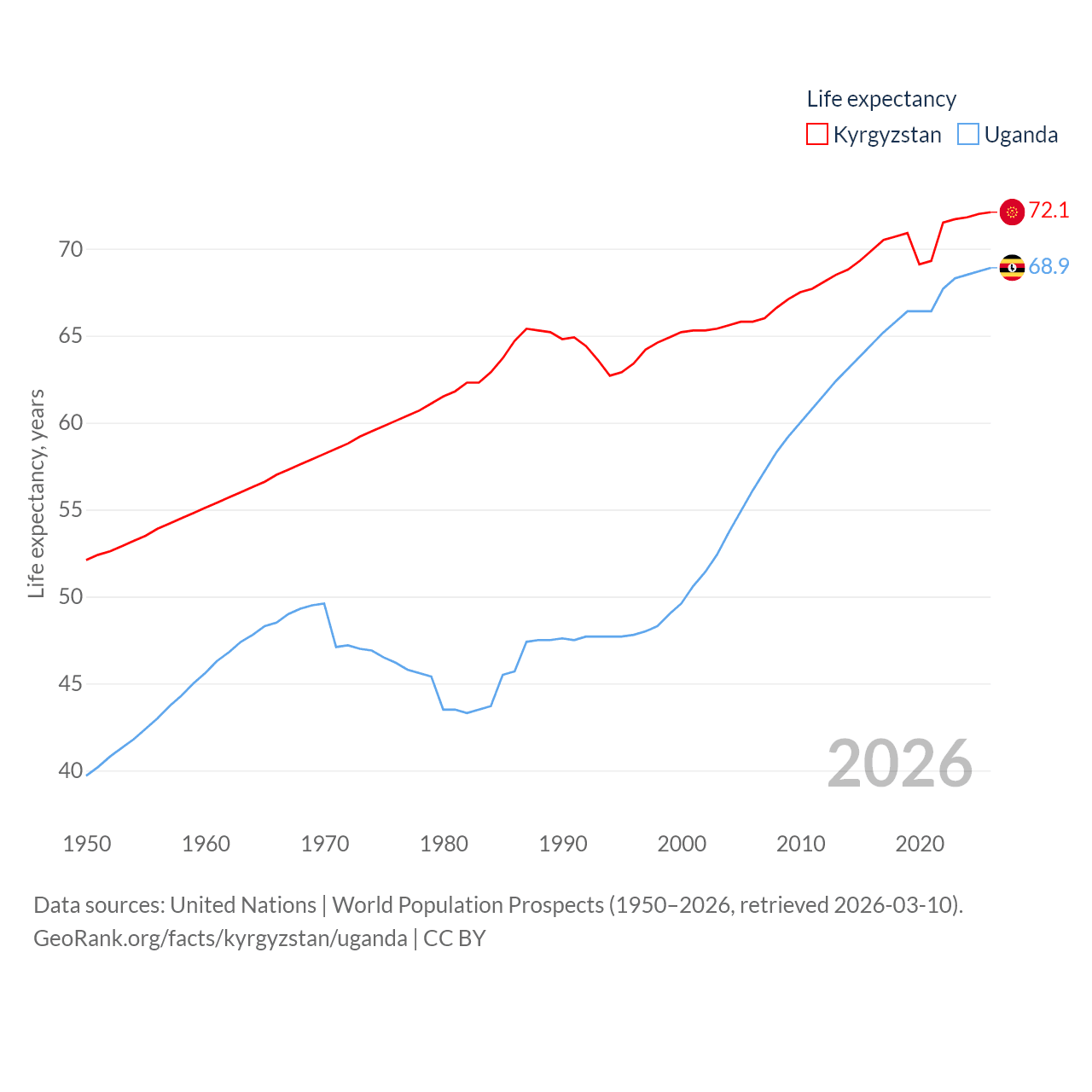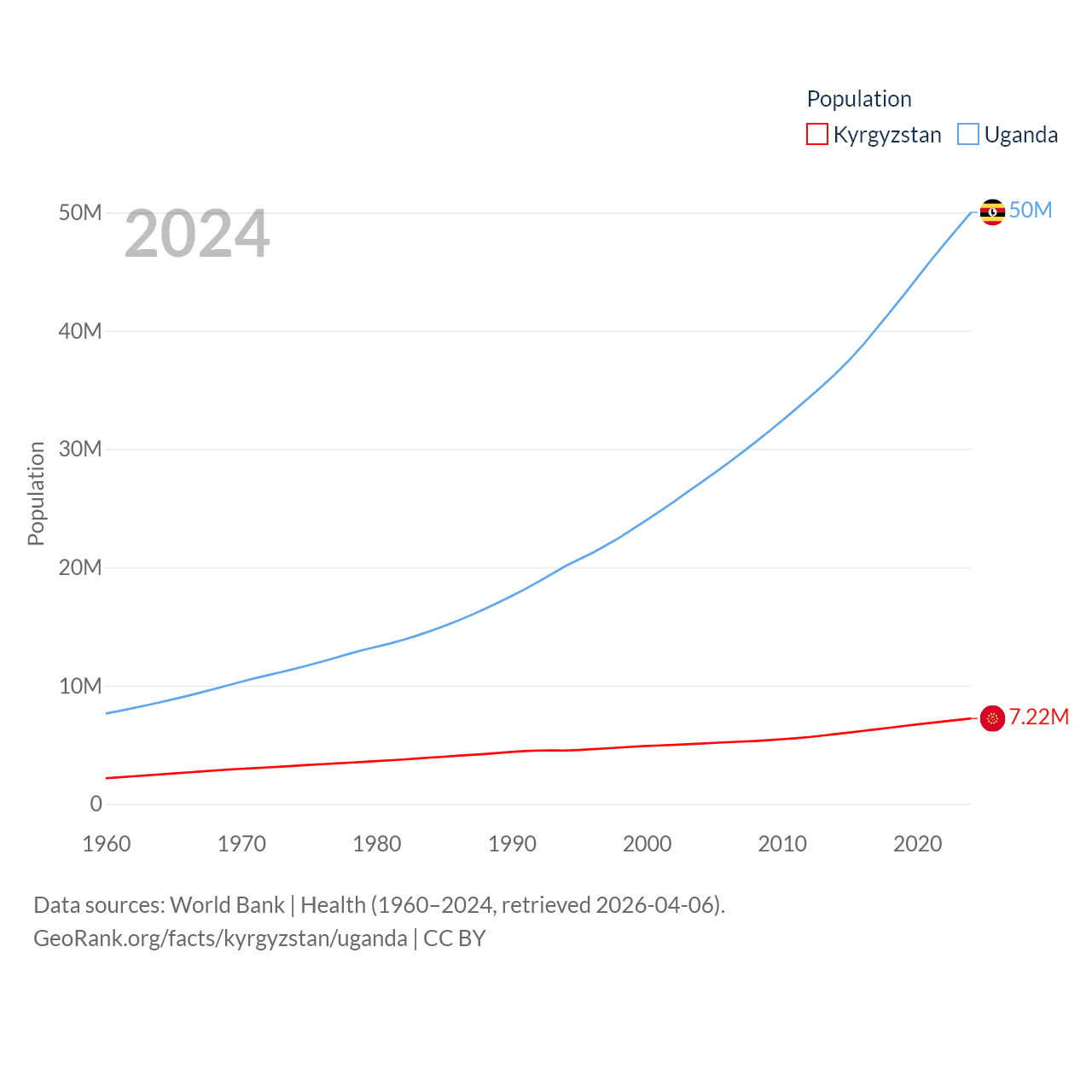 Kyrgyzstan has a population of 7.22M (ranked 106/197), compared with 50M in Uganda (ranked 31/197). Kyrgyzstan's land area is 74,054 sq mi versus 77,421 sq mi for Uganda (ranked 86th vs. 84th).