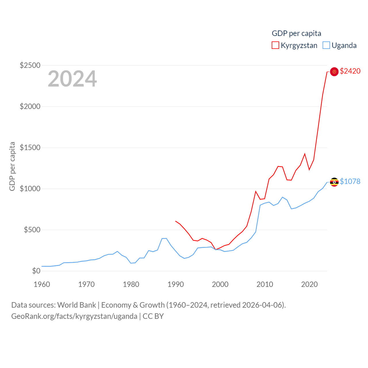 By GDP, Kyrgyzstan ranks 135/197 ($17.5B) and Uganda ranks 89/197 ($53.9B). By GDP per capita, Kyrgyzstan ranks 150/197 ($2,420), while Uganda ranks 176/197 ($1,078).