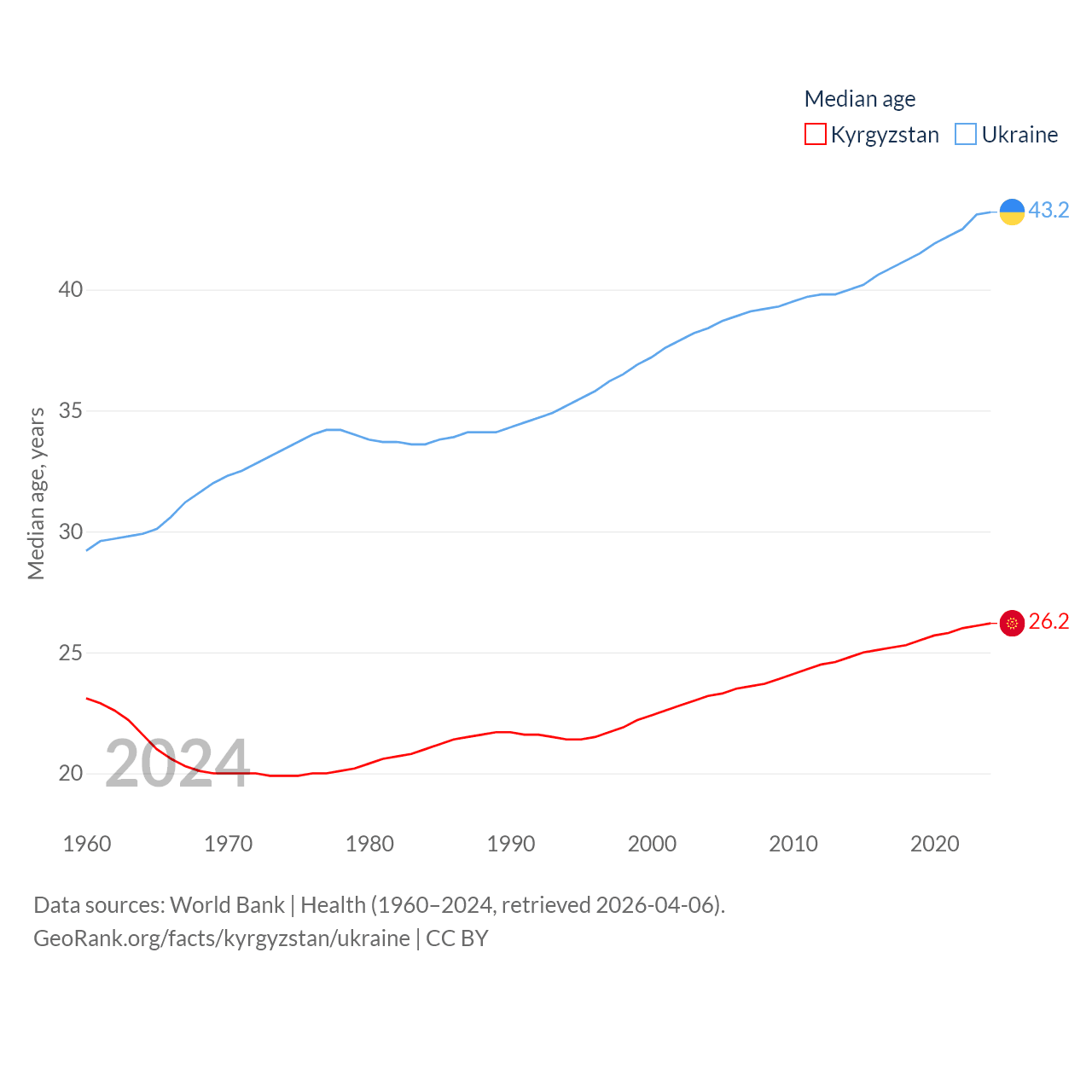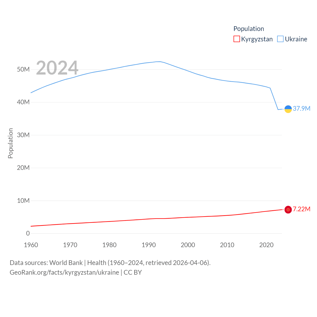 Kyrgyzstan has a population of 7.22M (ranked 106/197), compared with 37.9M in Ukraine (ranked 41/197). Kyrgyzstan's land area is 74,054 sq mi versus 223,708 sq mi for Ukraine (ranked 86th vs. 46th).