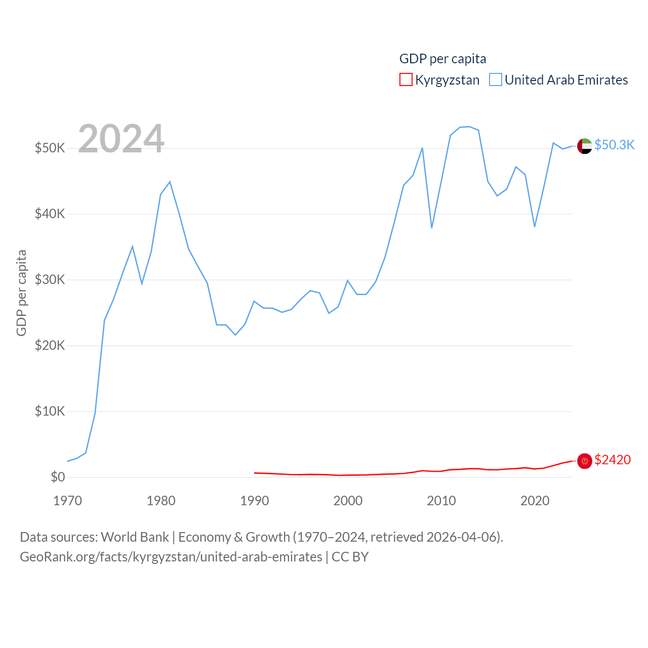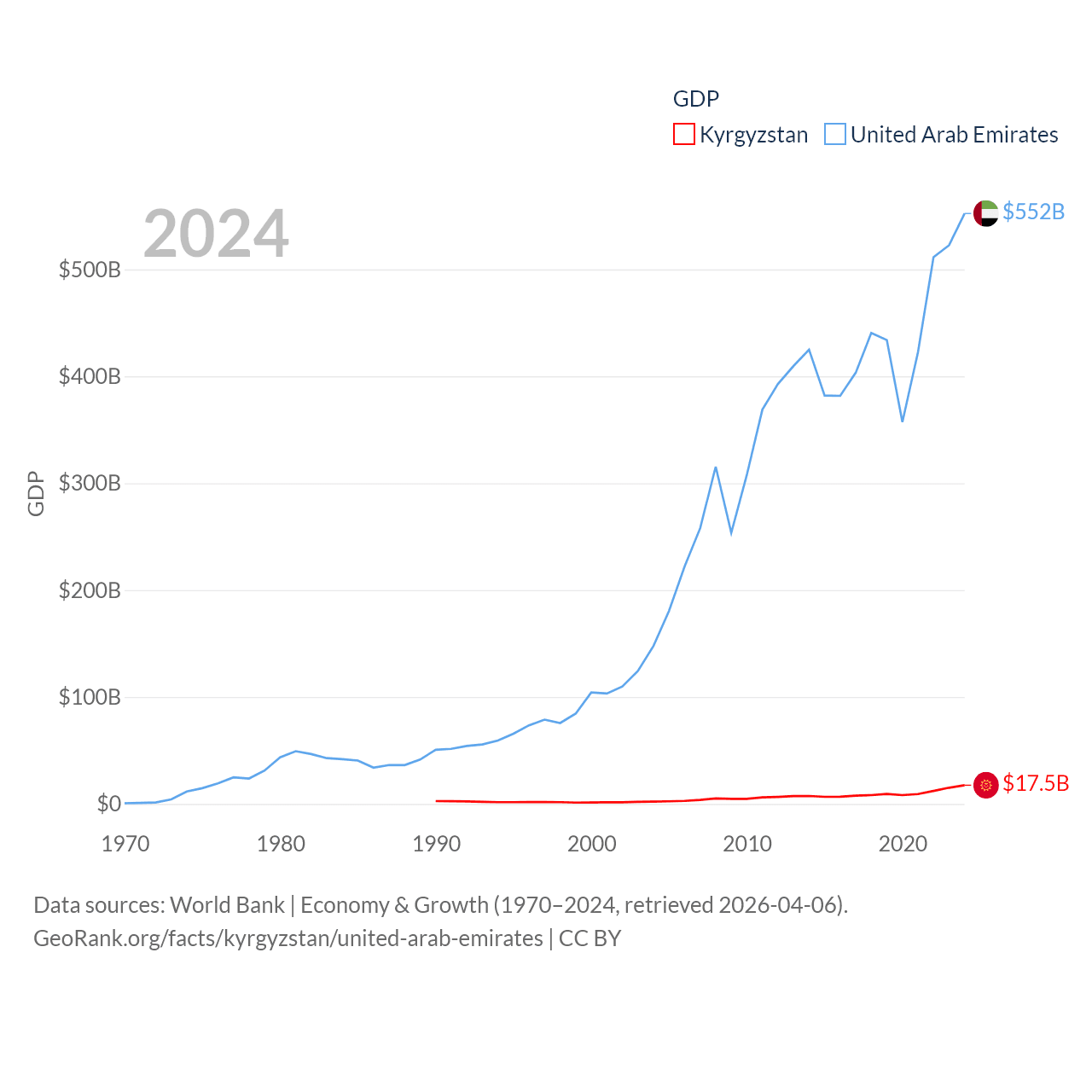 By GDP, Kyrgyzstan ranks 135/197 ($17.5B) and The United Arab Emirates ranks 27/197 ($552B). By GDP per capita, Kyrgyzstan ranks 150/197 ($2,420), while The United Arab Emirates ranks 24/197 ($50,274).