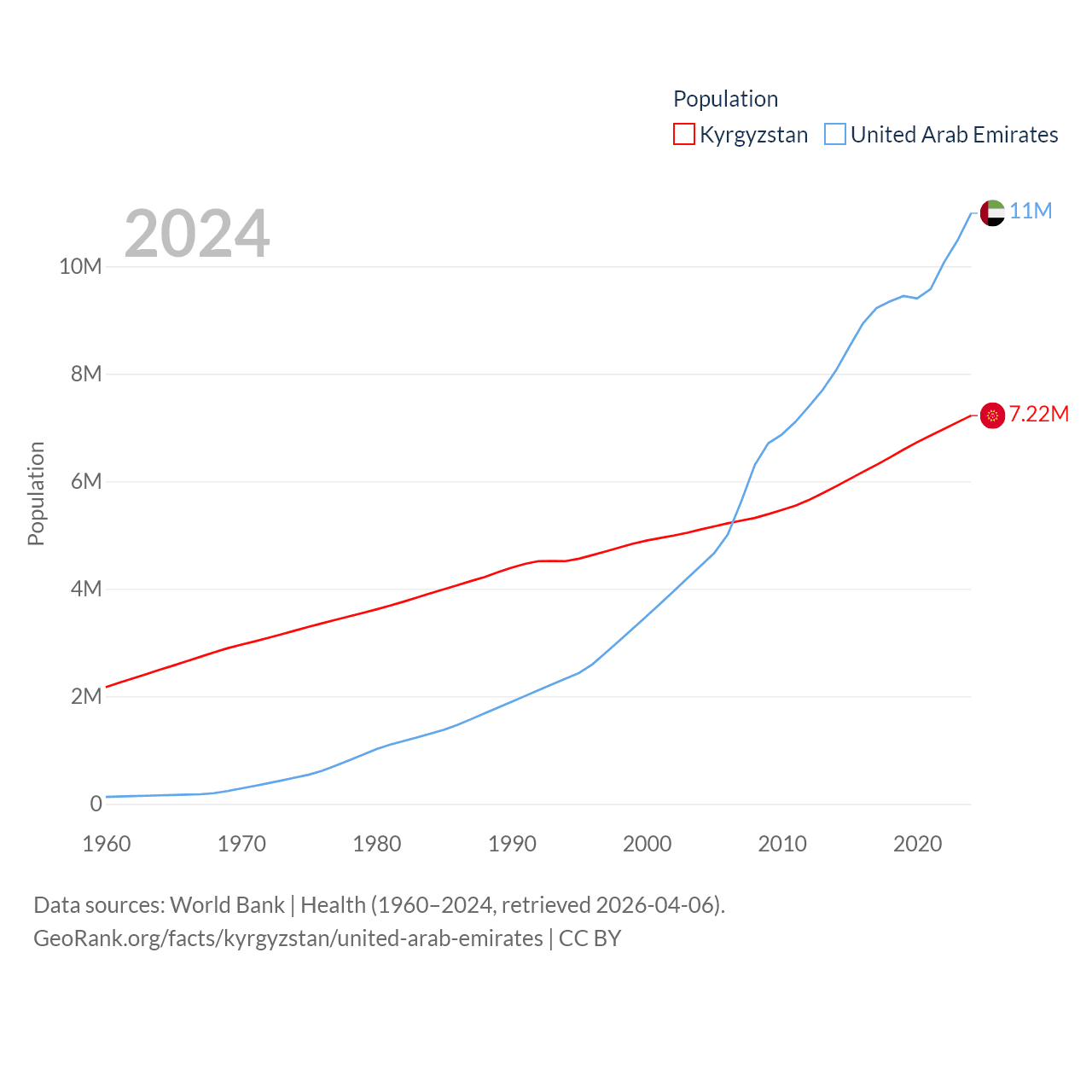 Kyrgyzstan has a population of 7.22M (ranked 106/197), compared with 11M in The United Arab Emirates (ranked 86/197). Kyrgyzstan's land area is 74,054 sq mi versus 27,421 sq mi for The United Arab Emirates (ranked 86th vs. 117th).