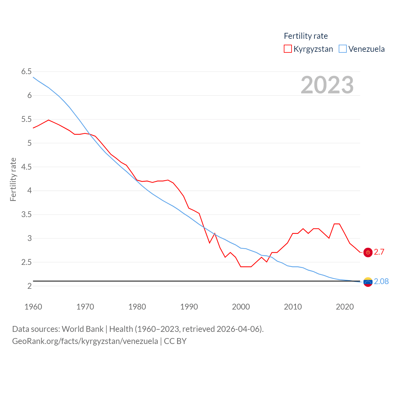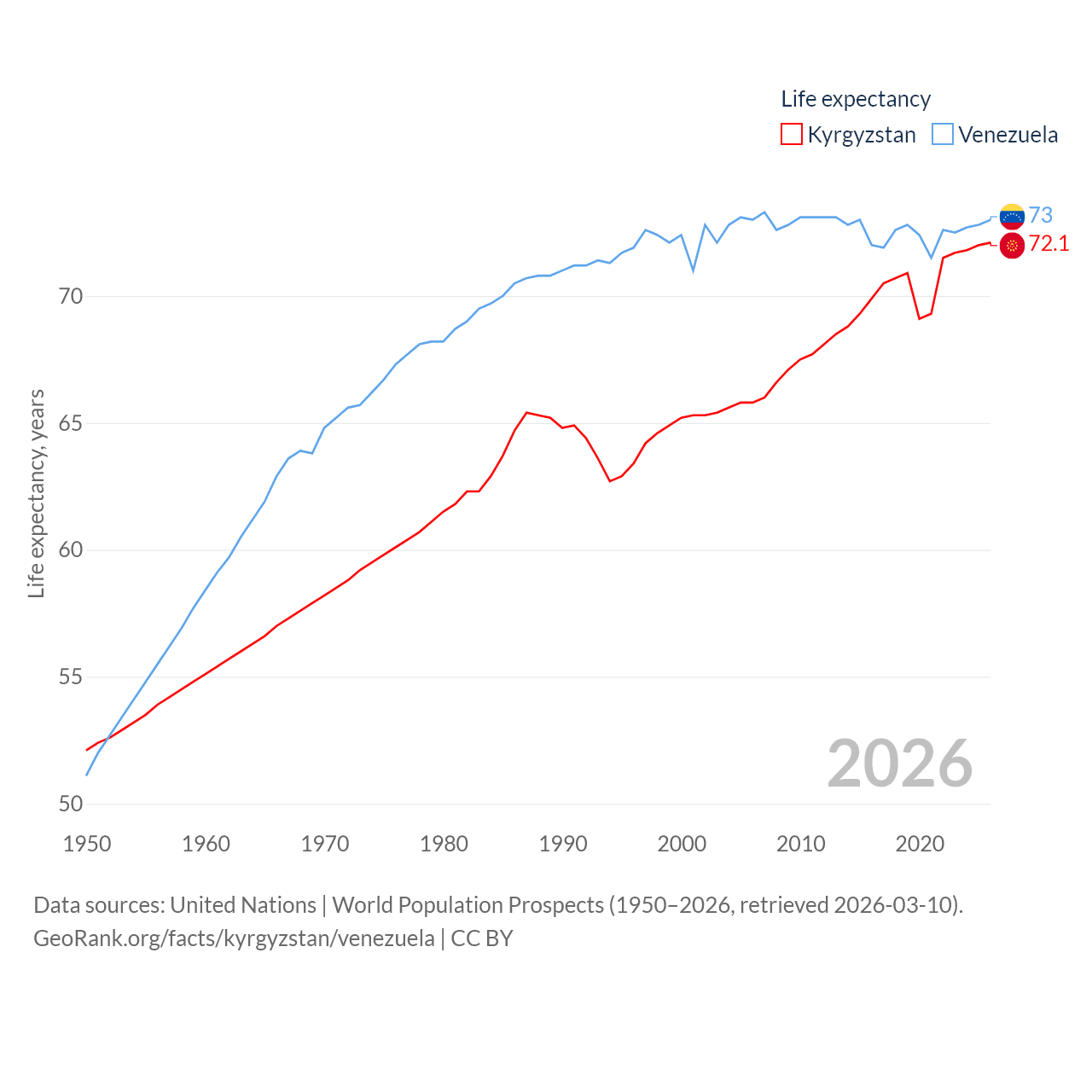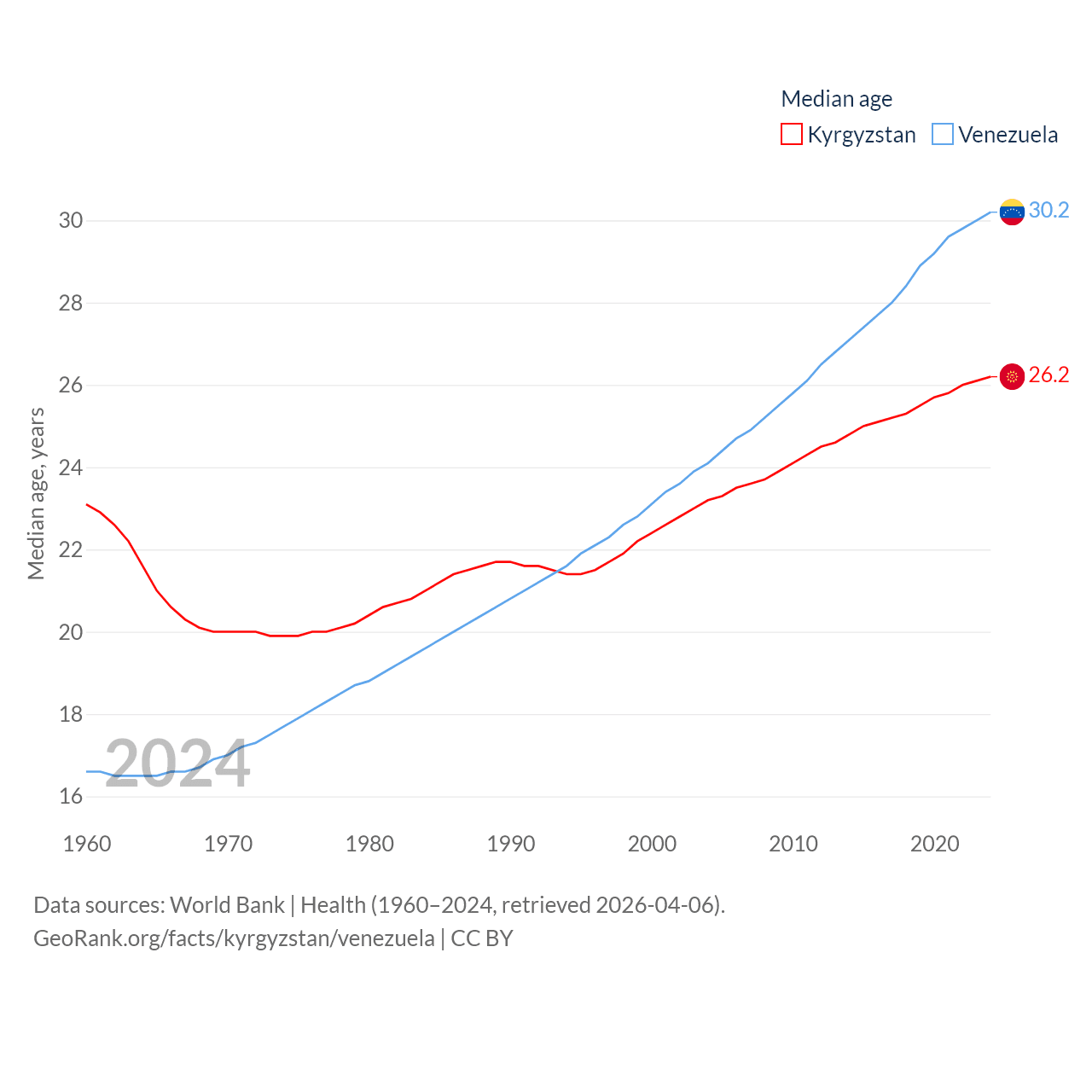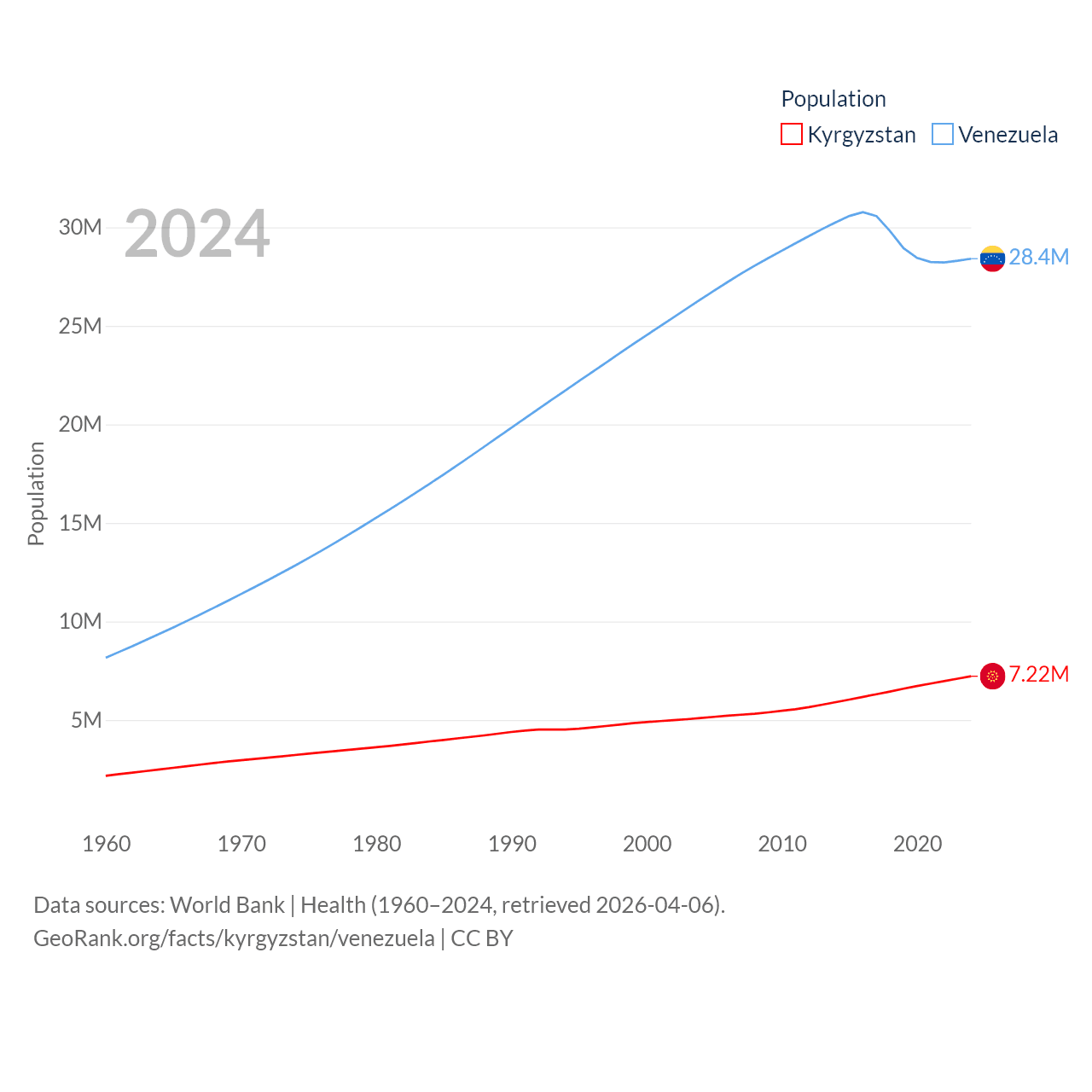 Kyrgyzstan has a population of 7.22M (ranked 106/197), compared with 28.4M in Venezuela (ranked 53/197). Kyrgyzstan's land area is 74,054 sq mi versus 340,561 sq mi for Venezuela (ranked 86th vs. 32nd).