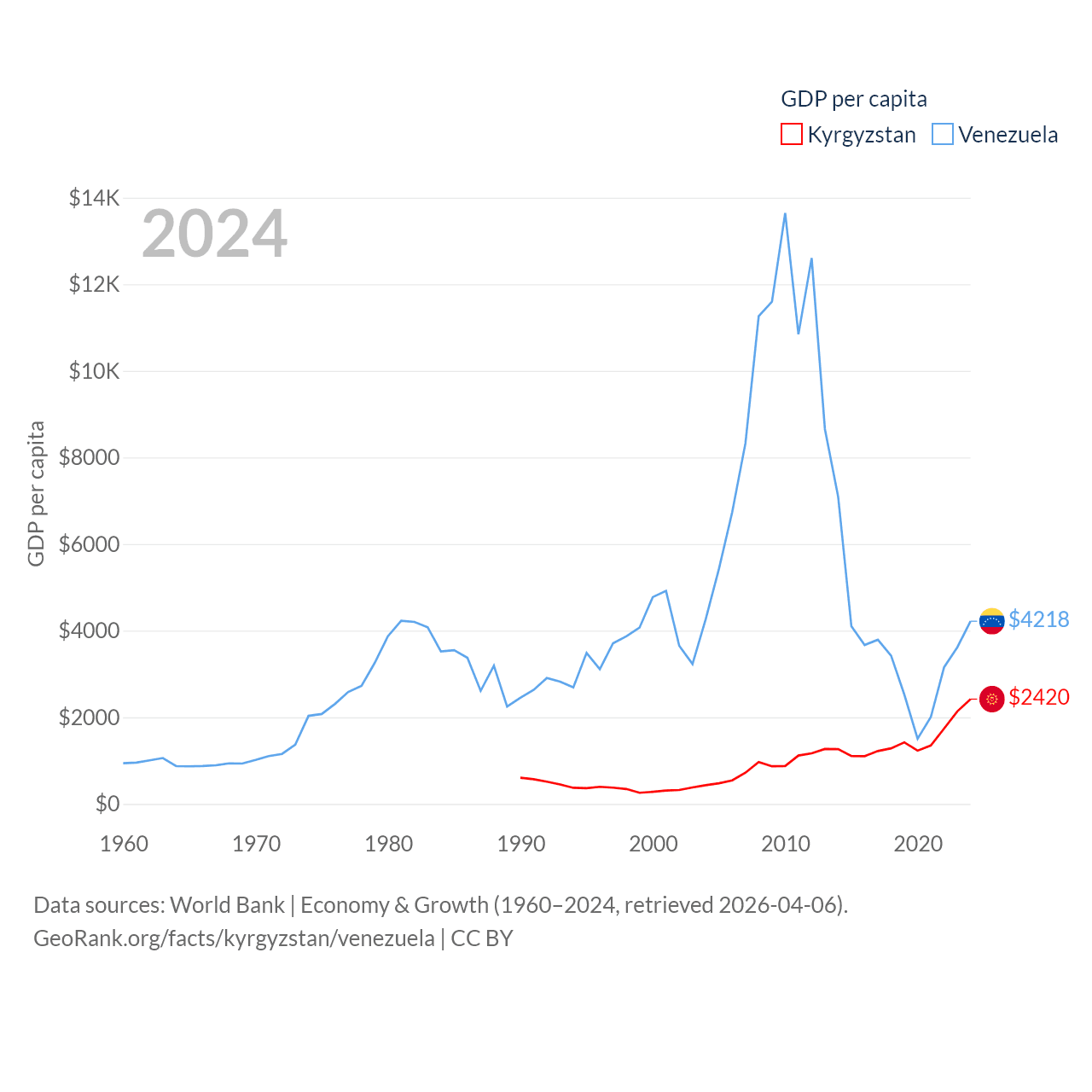 By GDP, Kyrgyzstan ranks 135/197 ($17.5B) and Venezuela ranks 65/197 ($120B). By GDP per capita, Kyrgyzstan ranks 150/197 ($2,420), while Venezuela ranks 128/197 ($4,218).