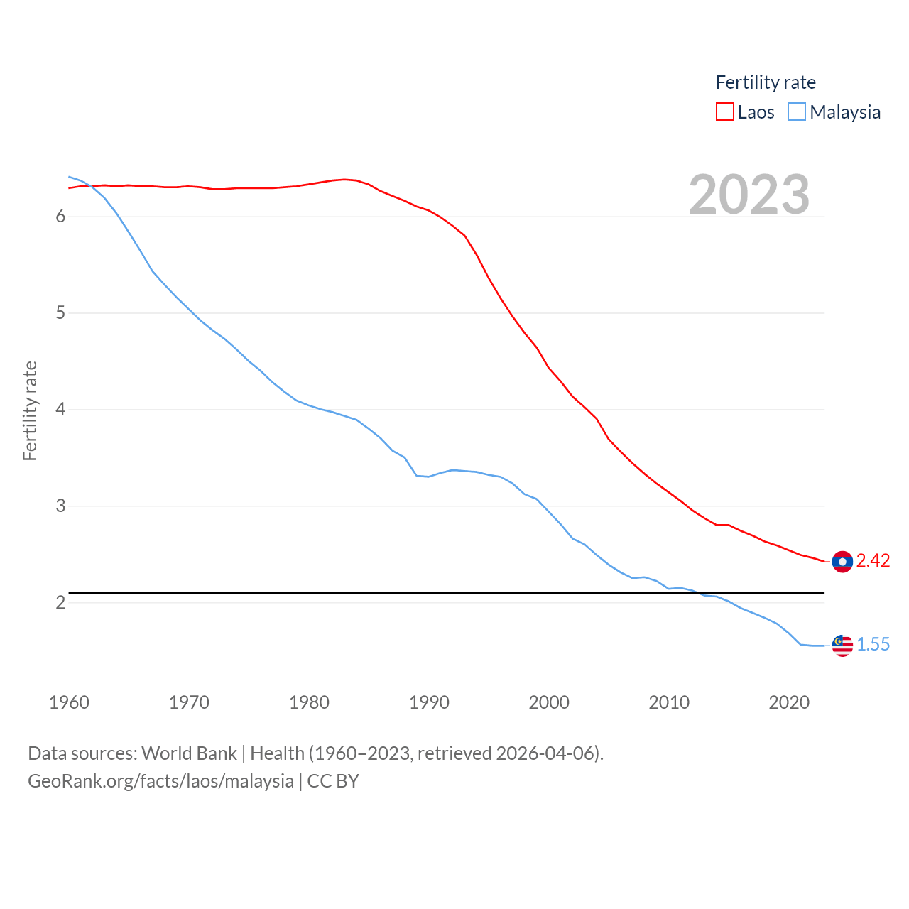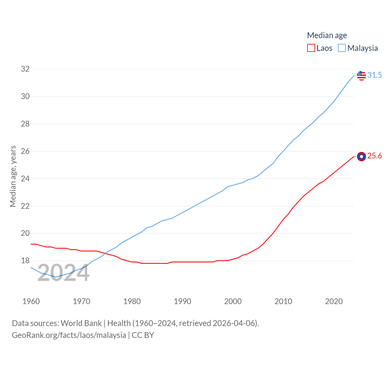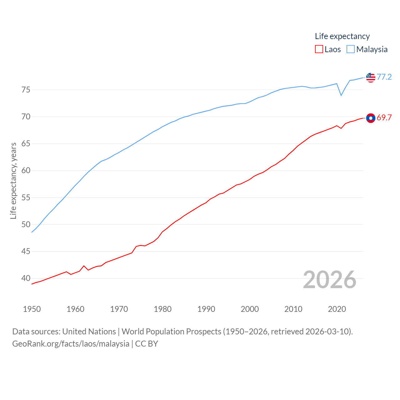 Laos has a population of 7.77M (ranked 103/197), compared with 35.6M in Malaysia (ranked 44/197). Laos' land area is 89,112 sq mi versus 126,854 sq mi for Malaysia (ranked 79th vs. 65th).