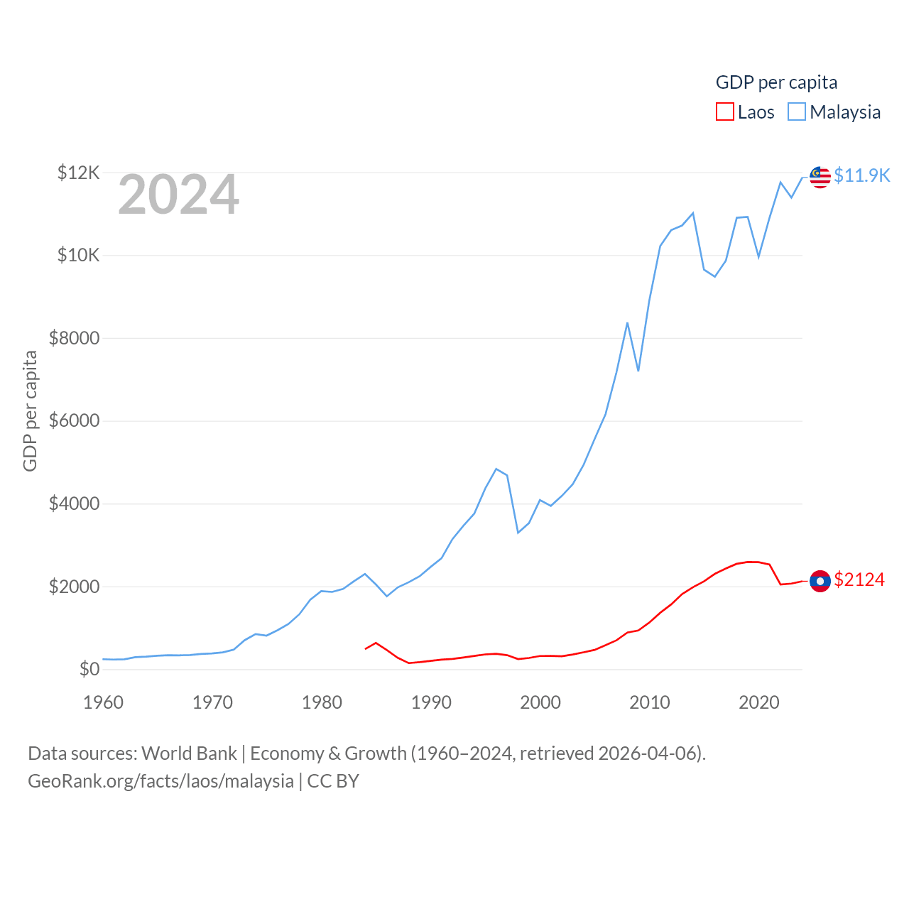 By GDP, Laos ranks 139/197 ($16.5B) and Malaysia ranks 38/197 ($422B). By GDP per capita, Laos ranks 155/197 ($2,124), while Malaysia ranks 79/197 ($11,874).