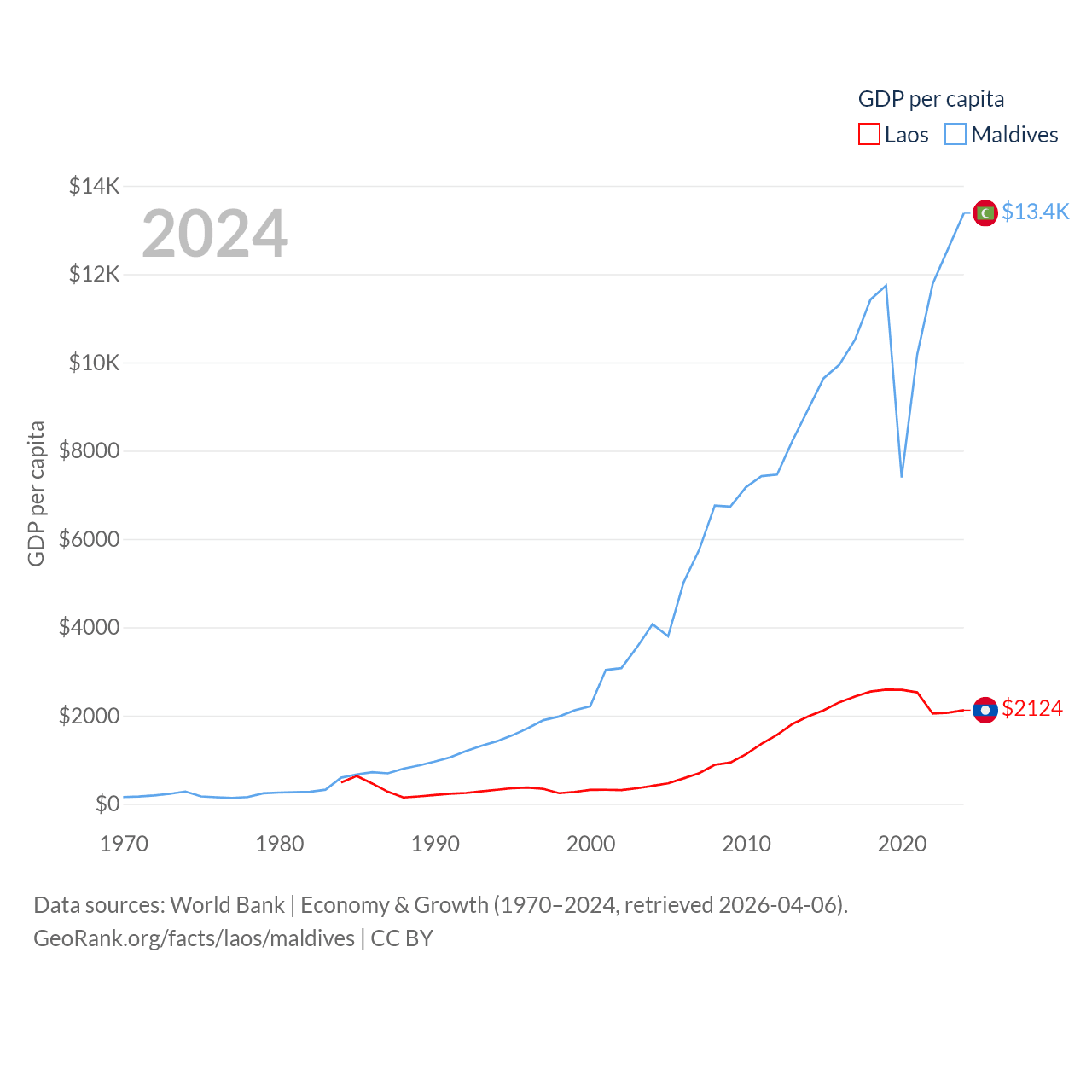 By GDP, Laos ranks 139/197 ($16.5B) and Maldives ranks 159/197 ($7.06B). By GDP per capita, Laos ranks 155/197 ($2,124), while Maldives ranks 75/197 ($13,379).