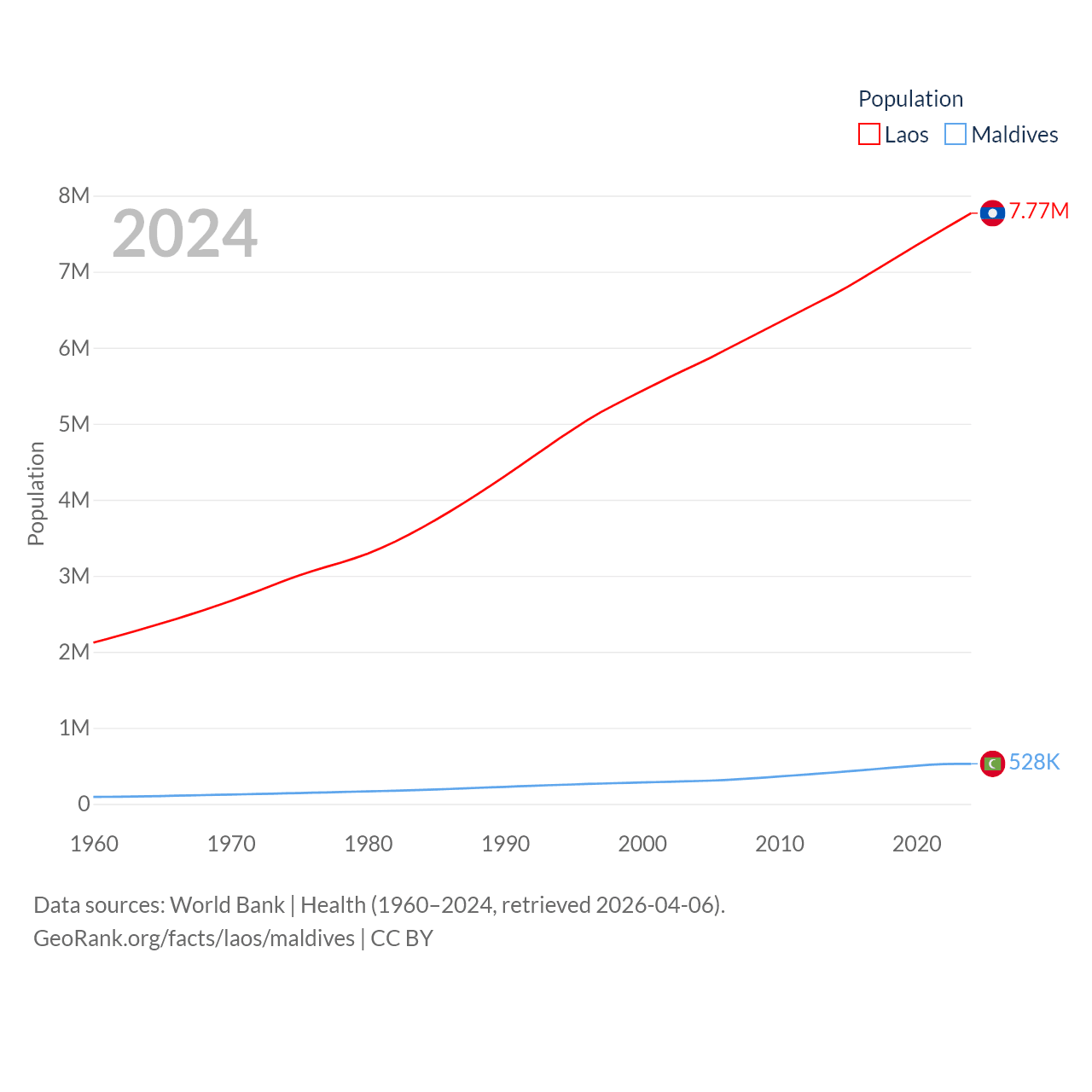 Laos has a population of 7.77M (ranked 103/197), compared with 528K in Maldives (ranked 168/197). Laos' land area is 89,112 sq mi versus 115.1 sq mi for Maldives (ranked 79th vs. 188th).