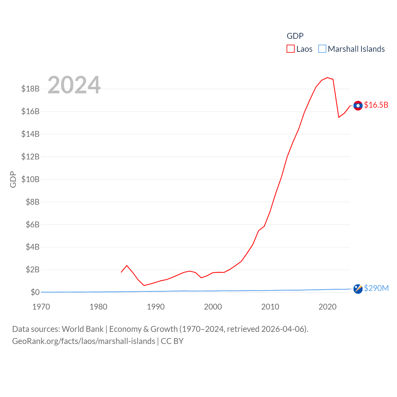 By GDP, Laos ranks 139/197 ($16.5B) and The Marshall Islands ranks 193/197 ($290M). By GDP per capita, Laos ranks 155/197 ($2,124), while The Marshall Islands ranks 96/197 ($7,726).