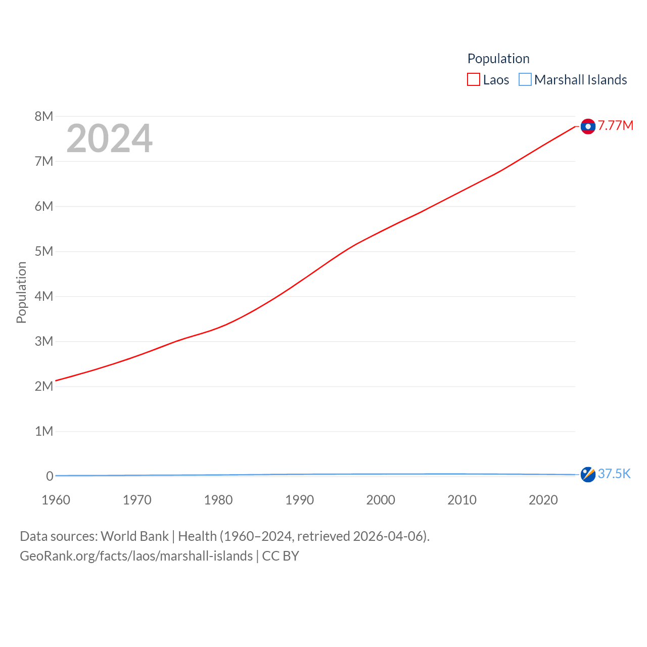 Laos has a population of 7.77M (ranked 103/197), compared with 37.5K in The Marshall Islands (ranked 192/197). Laos' land area is 89,112 sq mi versus 69.5 sq mi for The Marshall Islands (ranked 79th vs. 191st).