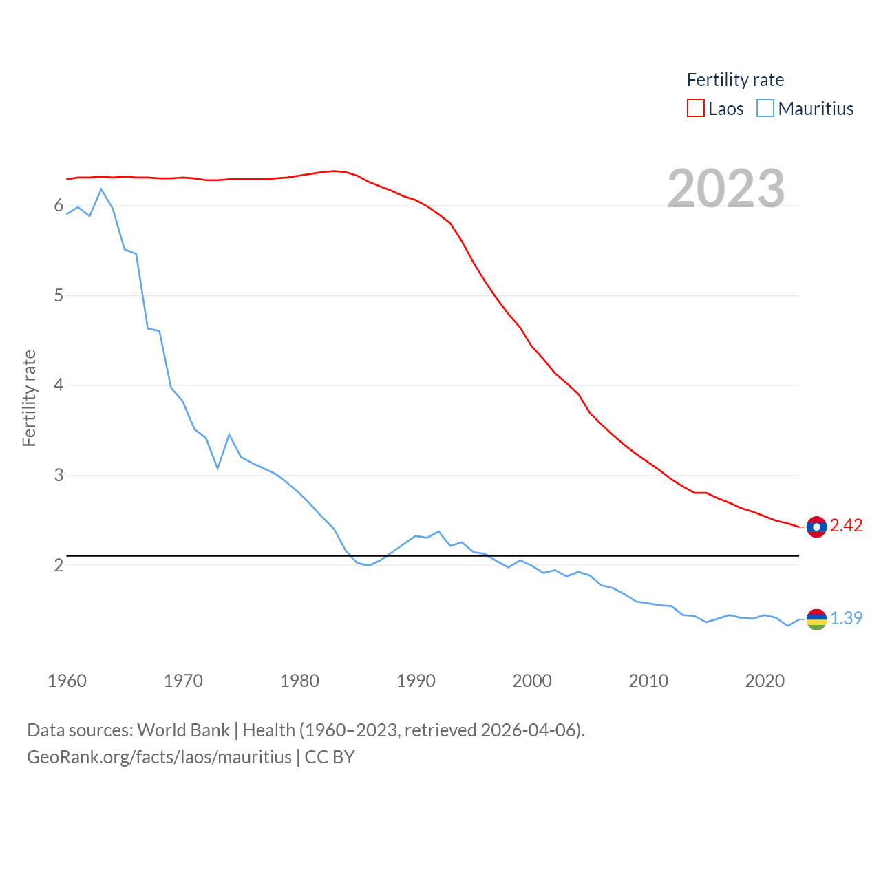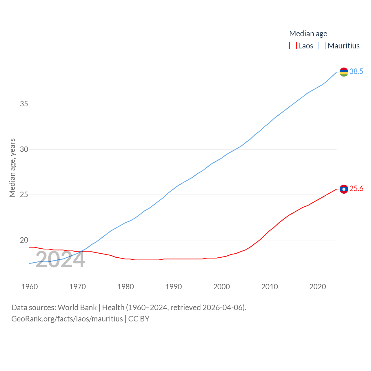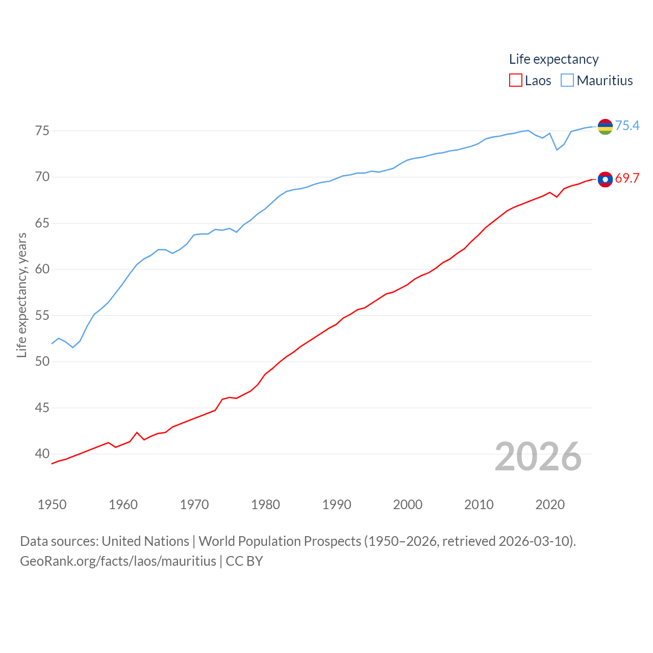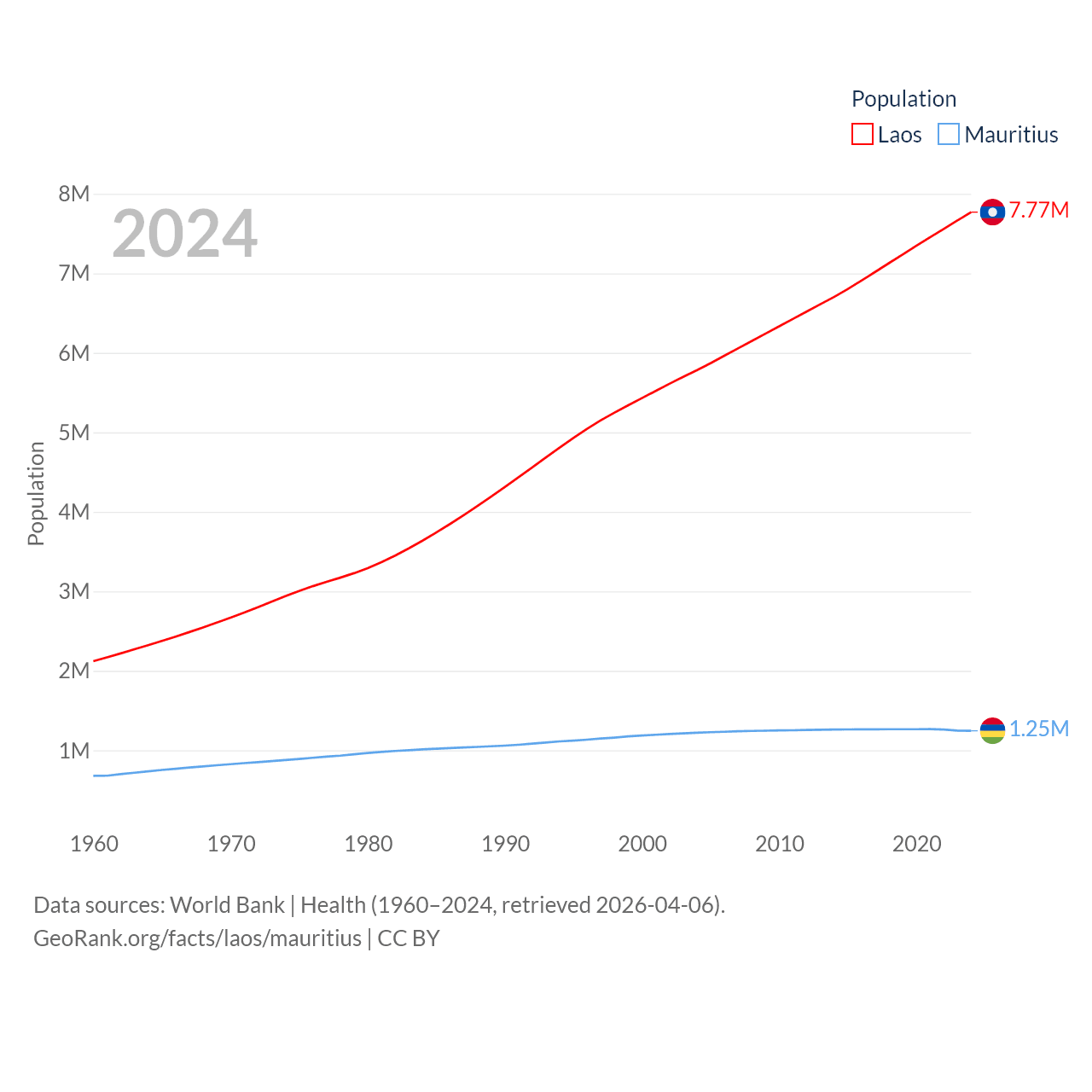 Laos has a population of 7.77M (ranked 103/197), compared with 1.25M in Mauritius (ranked 156/197). Laos' land area is 89,112 sq mi versus 771 sq mi for Mauritius (ranked 79th vs. 170th).