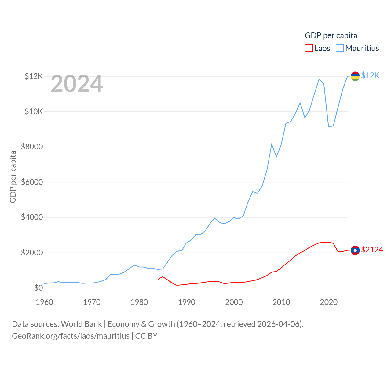 By GDP, Laos ranks 139/197 ($16.5B) and Mauritius ranks 143/197 ($14.9B). By GDP per capita, Laos ranks 155/197 ($2,124), while Mauritius ranks 78/197 ($11,991).