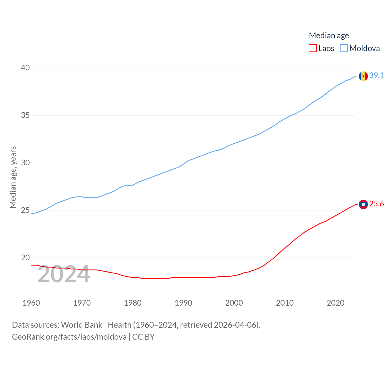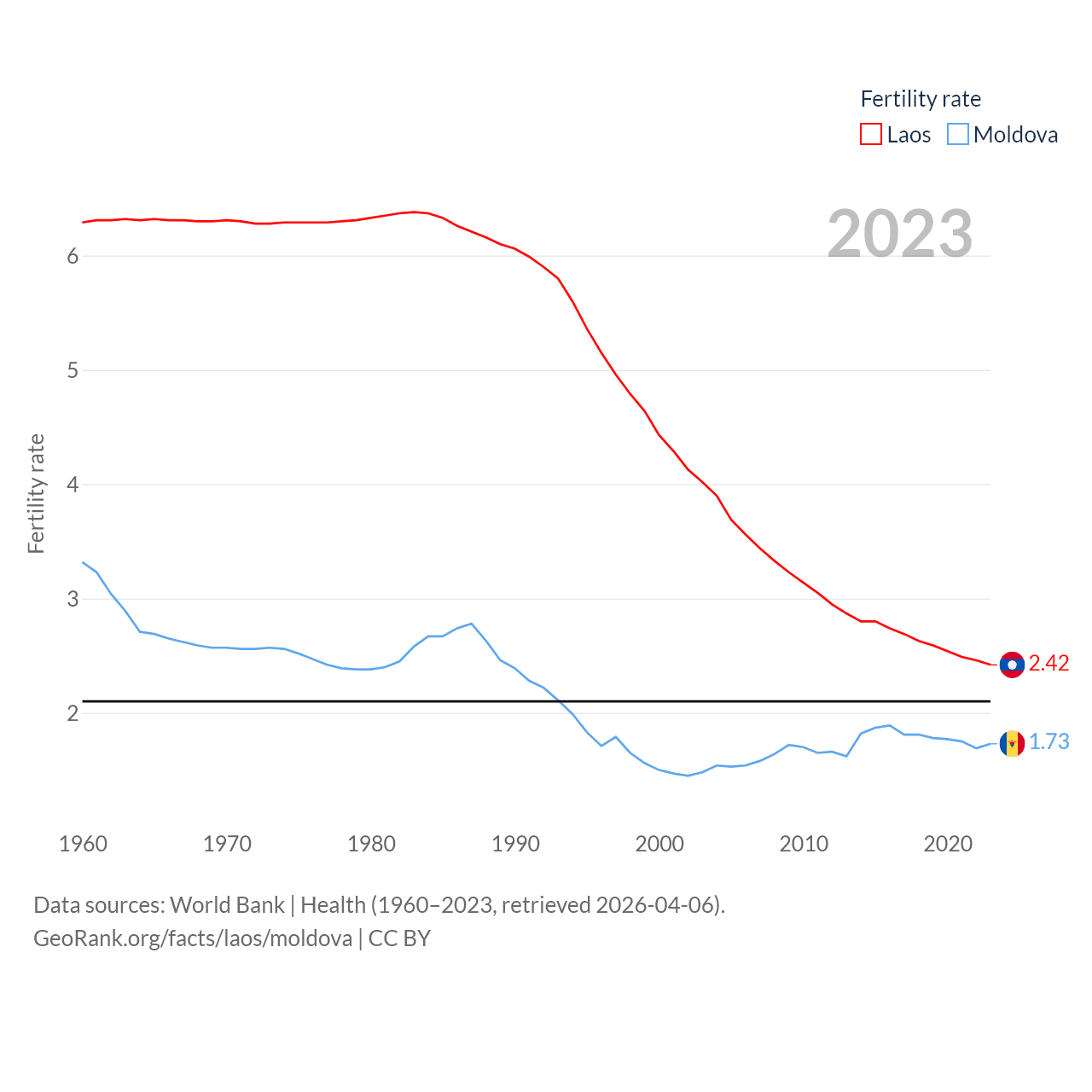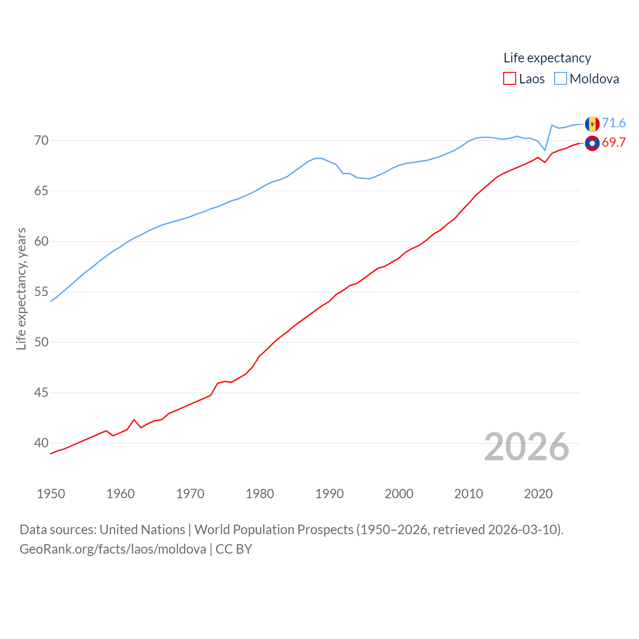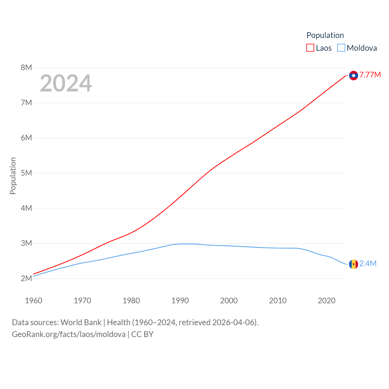 Laos has a population of 7.77M (ranked 103/197), compared with 2.4M in Moldova (ranked 143/197). Laos' land area is 89,112 sq mi versus 12,714 sq mi for Moldova (ranked 79th vs. 135th).