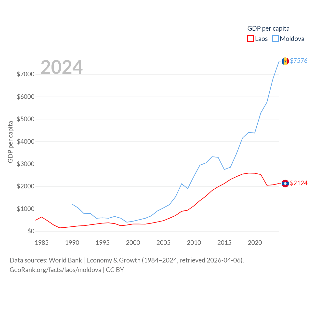 By GDP, Laos ranks 139/197 ($16.5B) and Moldova ranks 134/197 ($18.2B). By GDP per capita, Laos ranks 155/197 ($2,124), while Moldova ranks 99/197 ($7,576).