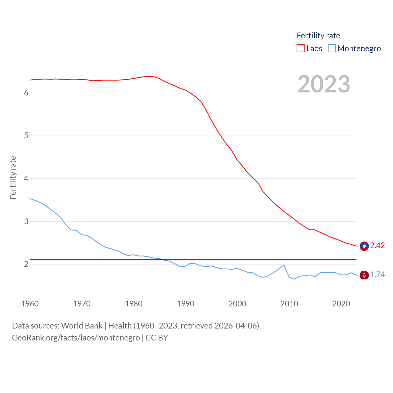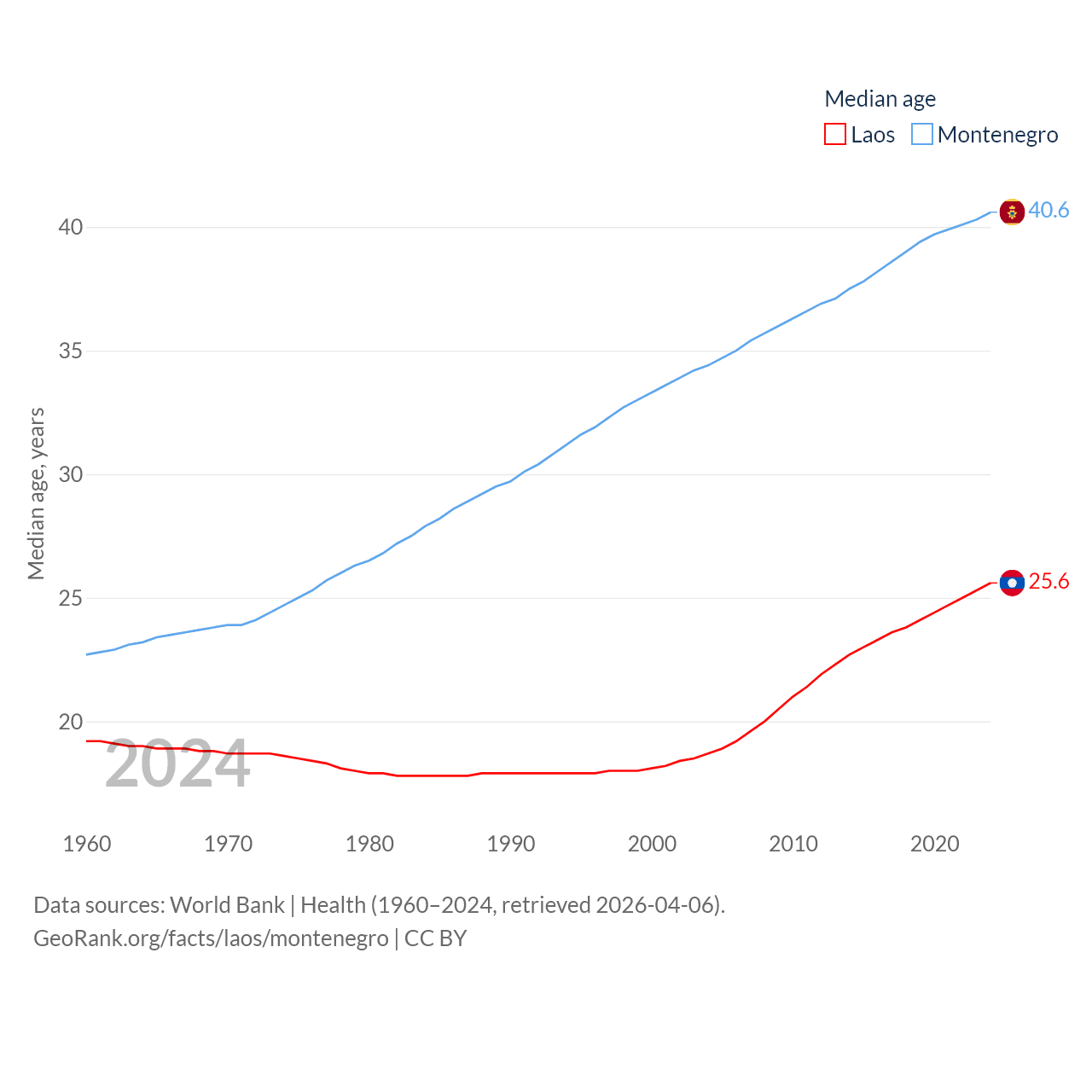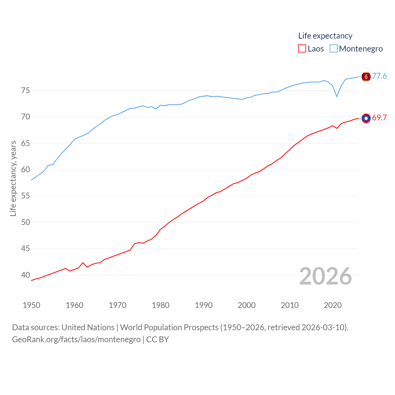 Laos has a population of 7.77M (ranked 103/197), compared with 624K in Montenegro (ranked 166/197). Laos' land area is 89,112 sq mi versus 5,193 sq mi for Montenegro (ranked 79th vs. 156th).