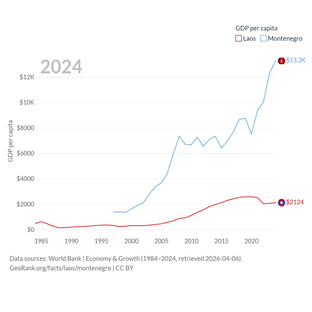 By GDP, Laos ranks 139/197 ($16.5B) and Montenegro ranks 155/197 ($8.27B). By GDP per capita, Laos ranks 155/197 ($2,124), while Montenegro ranks 77/197 ($13,263).