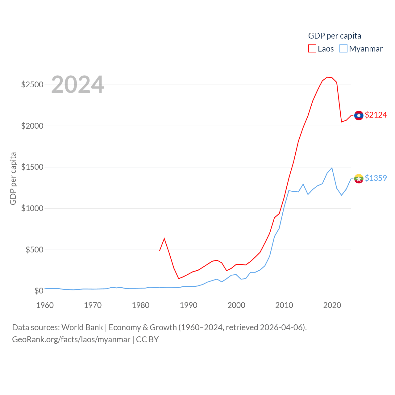 By GDP, Laos ranks 139/197 ($16.5B) and Myanmar ranks 85/197 ($74.1B). By GDP per capita, Laos ranks 155/197 ($2,124), while Myanmar ranks 165/197 ($1,359).