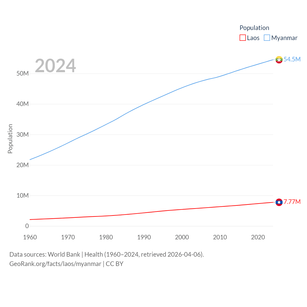 Laos has a population of 7.77M (ranked 103/197), compared with 54.5M in Myanmar (ranked 27/197). Laos' land area is 89,112 sq mi versus 251,997 sq mi for Myanmar (ranked 79th vs. 39th).
