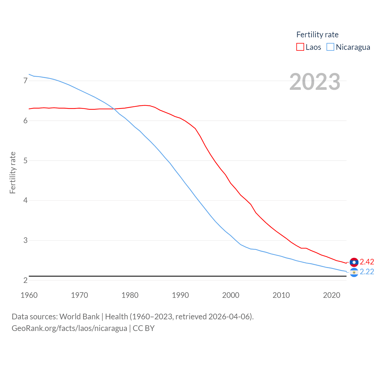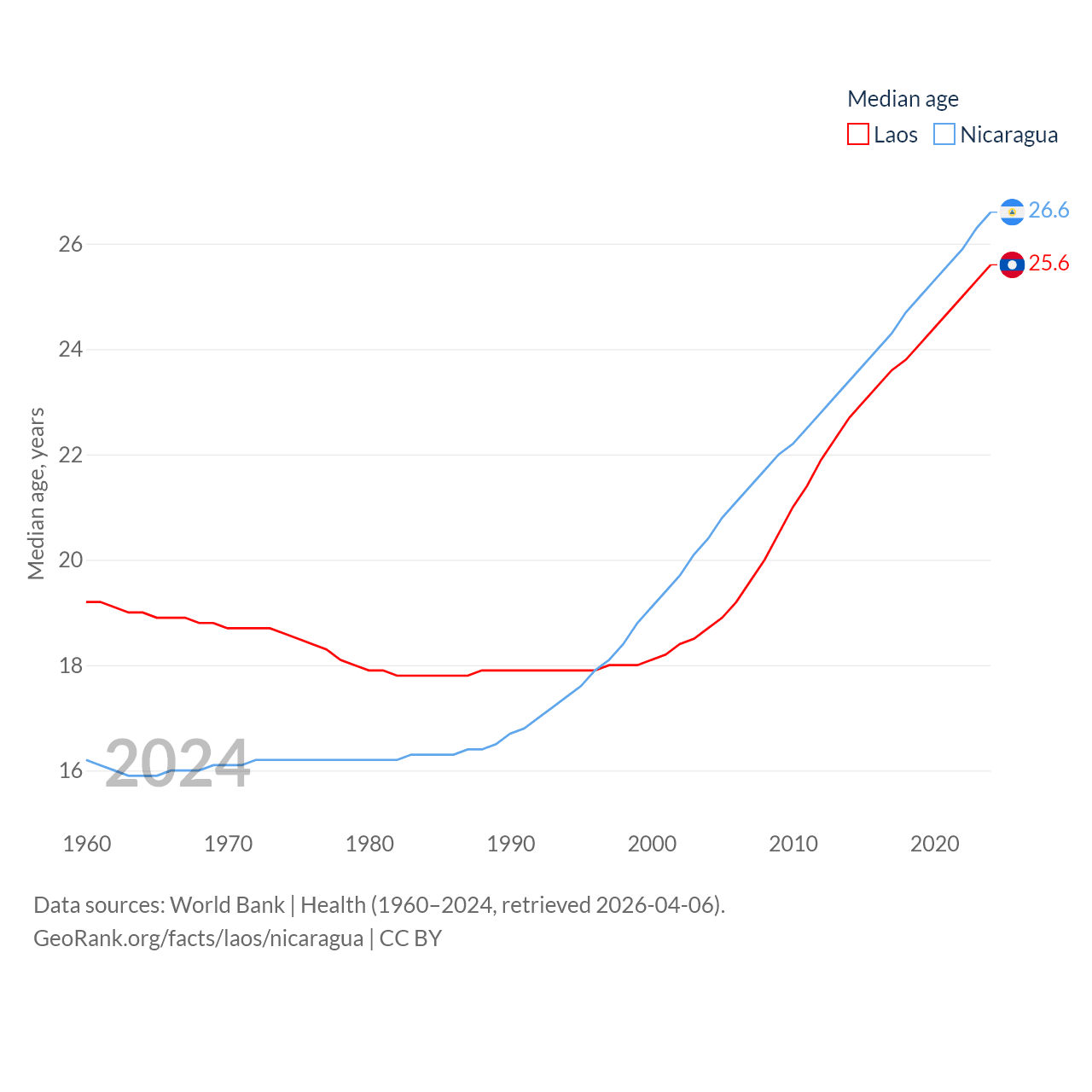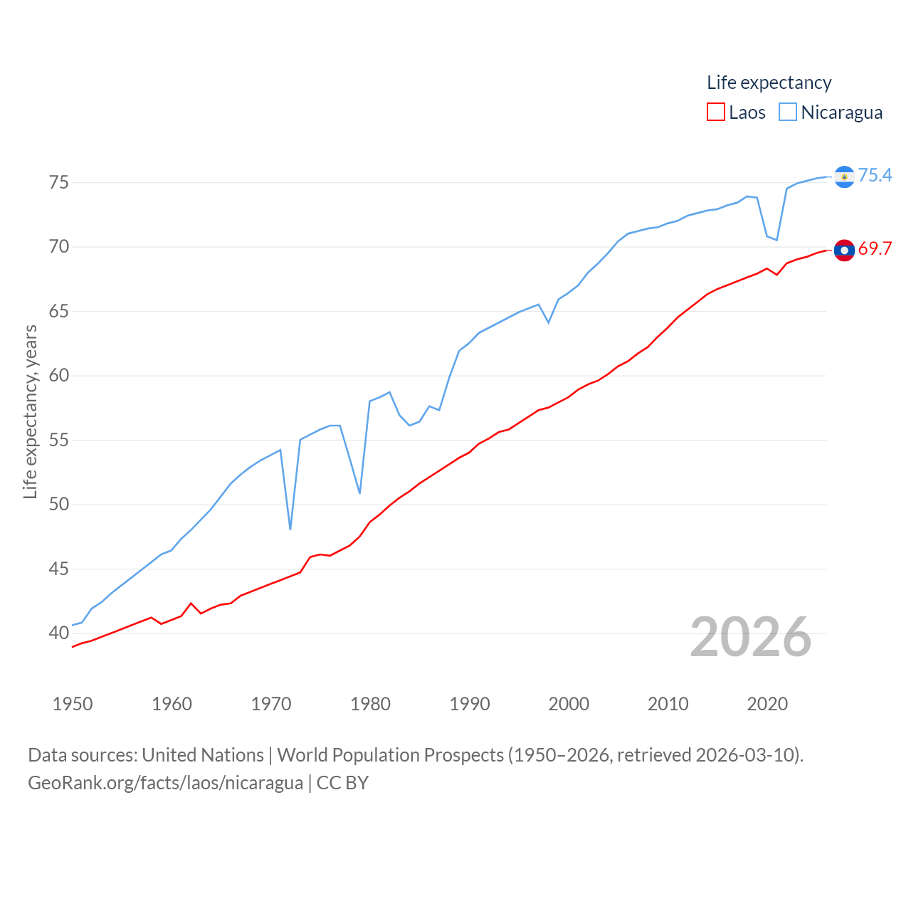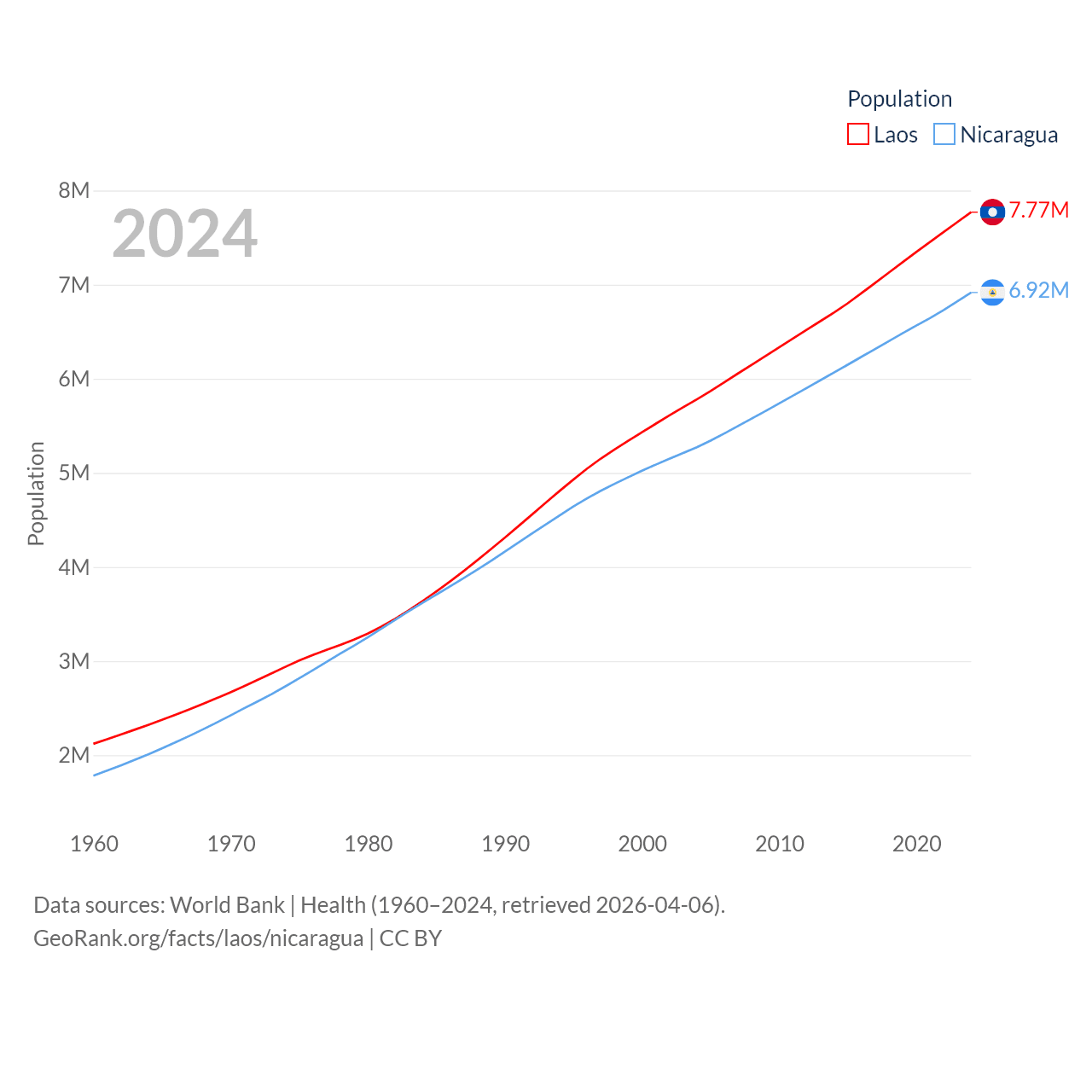Laos has a population of 7.77M (ranked 103/197), compared with 6.92M in Nicaragua (ranked 108/197). Laos' land area is 89,112 sq mi versus 46,464 sq mi for Nicaragua (ranked 79th vs. 98th).