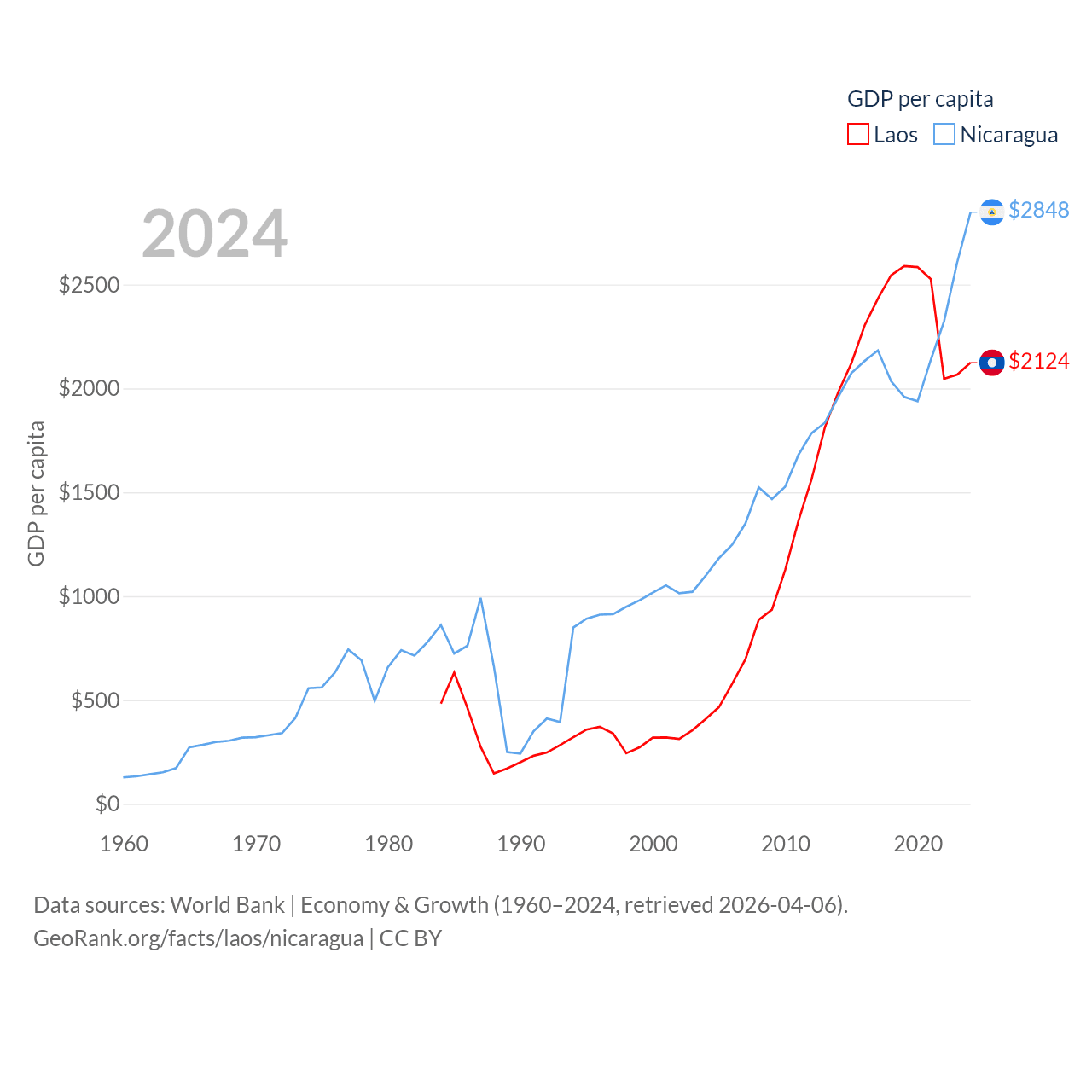 By GDP, Laos ranks 139/197 ($16.5B) and Nicaragua ranks 131/197 ($19.7B). By GDP per capita, Laos ranks 155/197 ($2,124), while Nicaragua ranks 141/197 ($2,848).