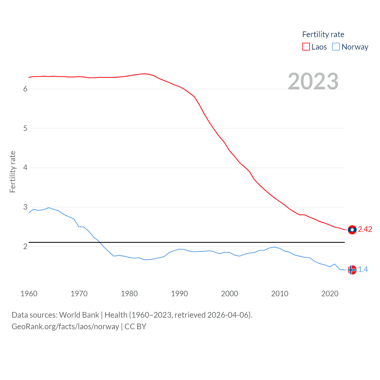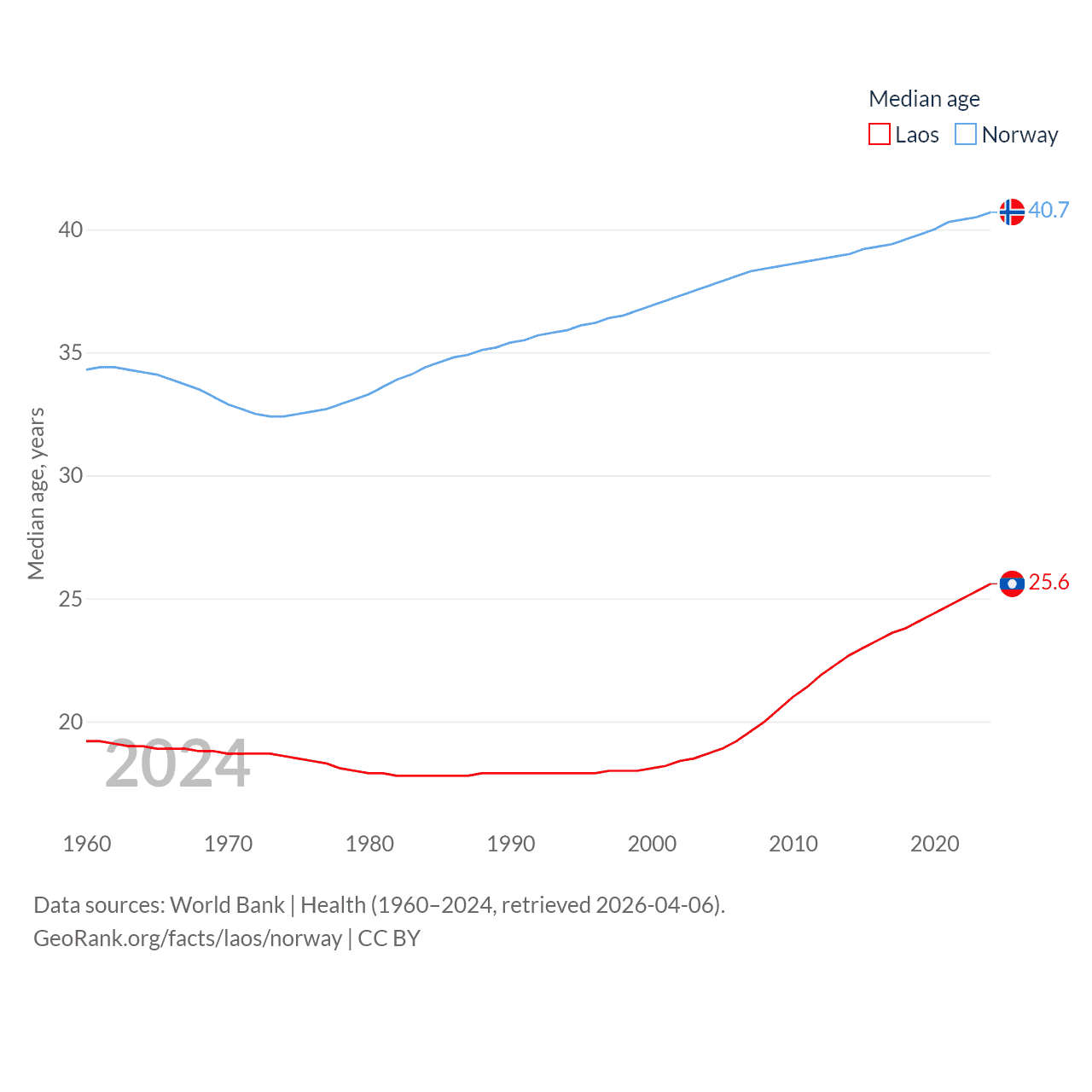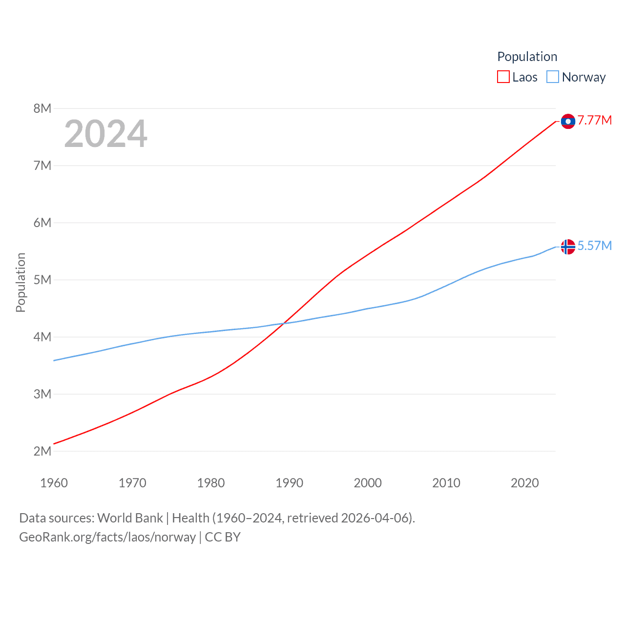Laos has a population of 7.77M (ranked 103/197), compared with 5.57M in Norway (ranked 118/197). Laos' land area is 89,112 sq mi versus 140,645 sq mi for Norway (ranked 79th vs. 62nd).