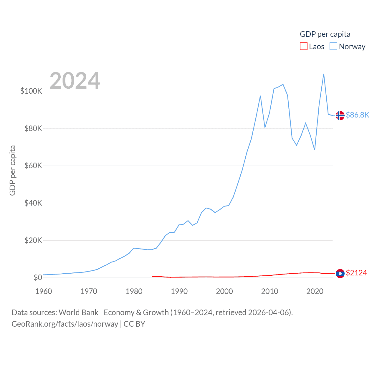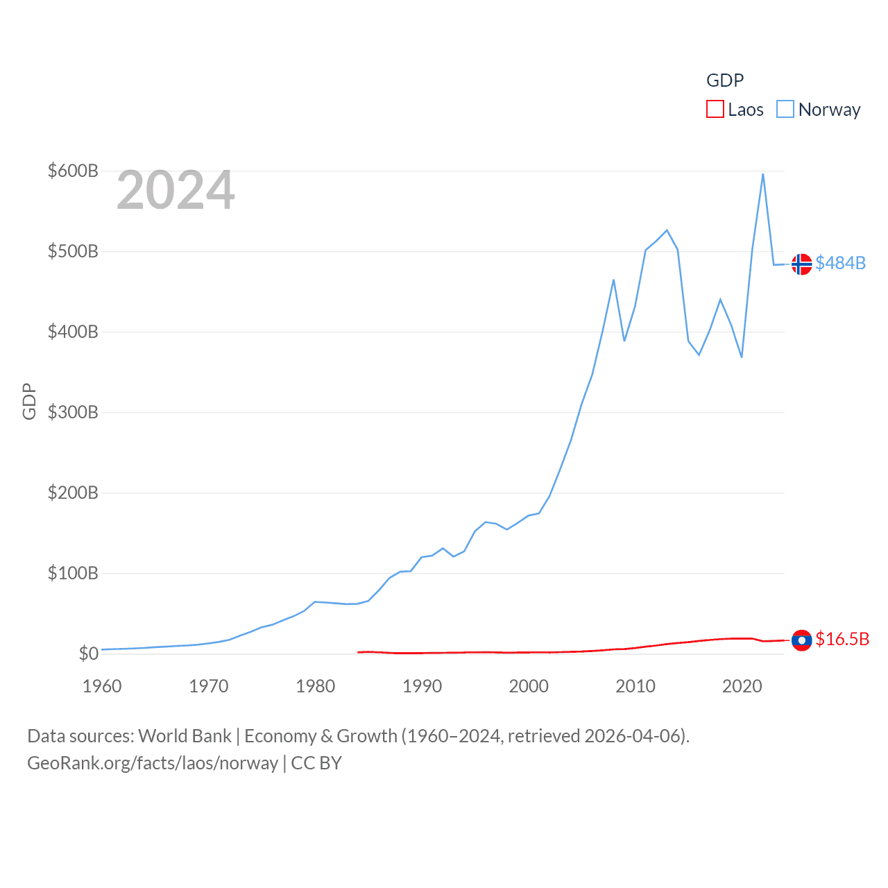 By GDP, Laos ranks 139/197 ($16.5B) and Norway ranks 32/197 ($484B). By GDP per capita, Laos ranks 155/197 ($2,124), while Norway ranks 8/197 ($86,785).