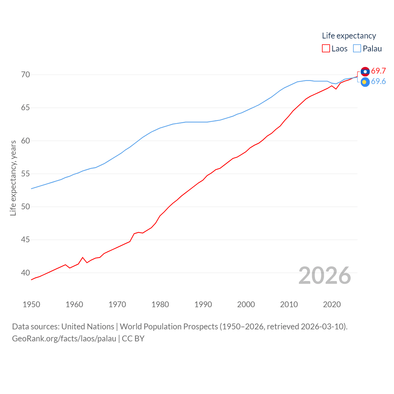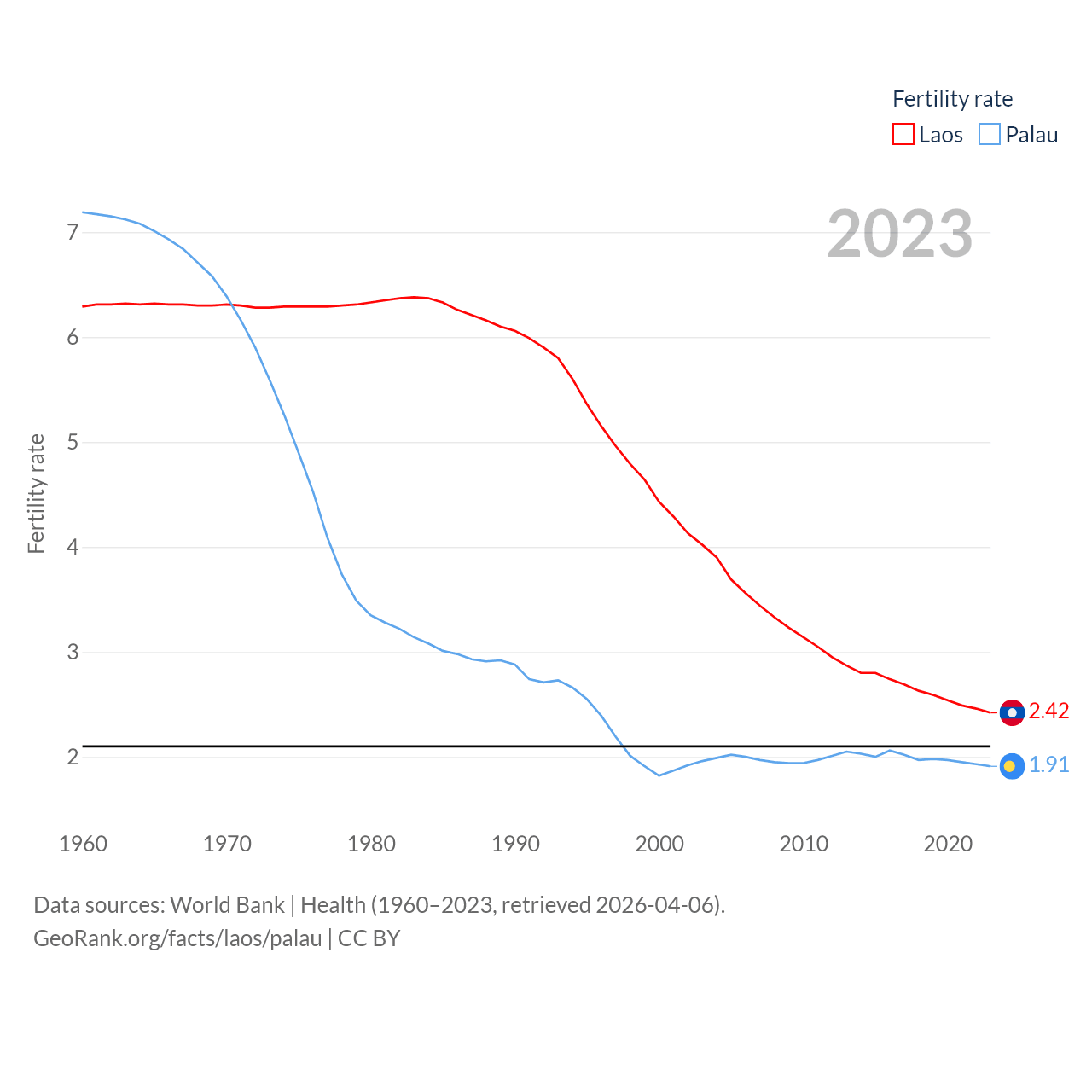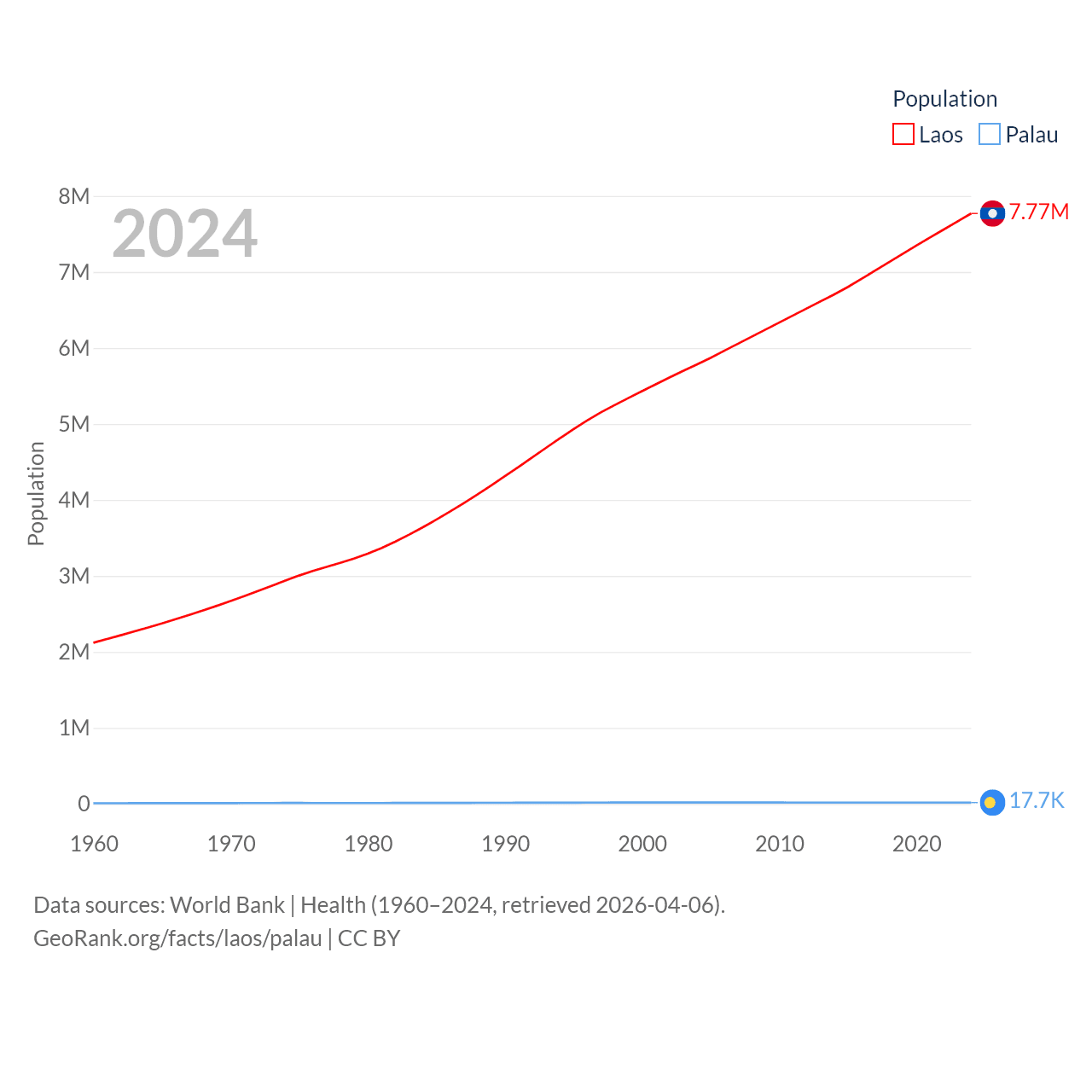 Laos has a population of 7.77M (ranked 103/197), compared with 17.7K in Palau (ranked 194/197). Laos' land area is 89,112 sq mi versus 177.6 sq mi for Palau (ranked 79th vs. 180th).