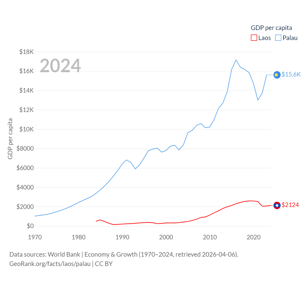 By GDP, Laos ranks 139/197 ($16.5B) and Palau ranks 194/197 ($277M). By GDP per capita, Laos ranks 155/197 ($2,124), while Palau ranks 67/197 ($15,611).