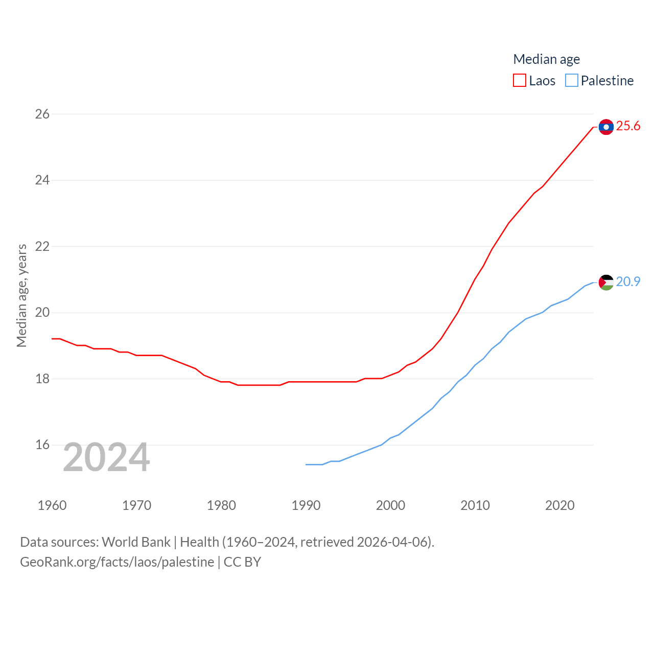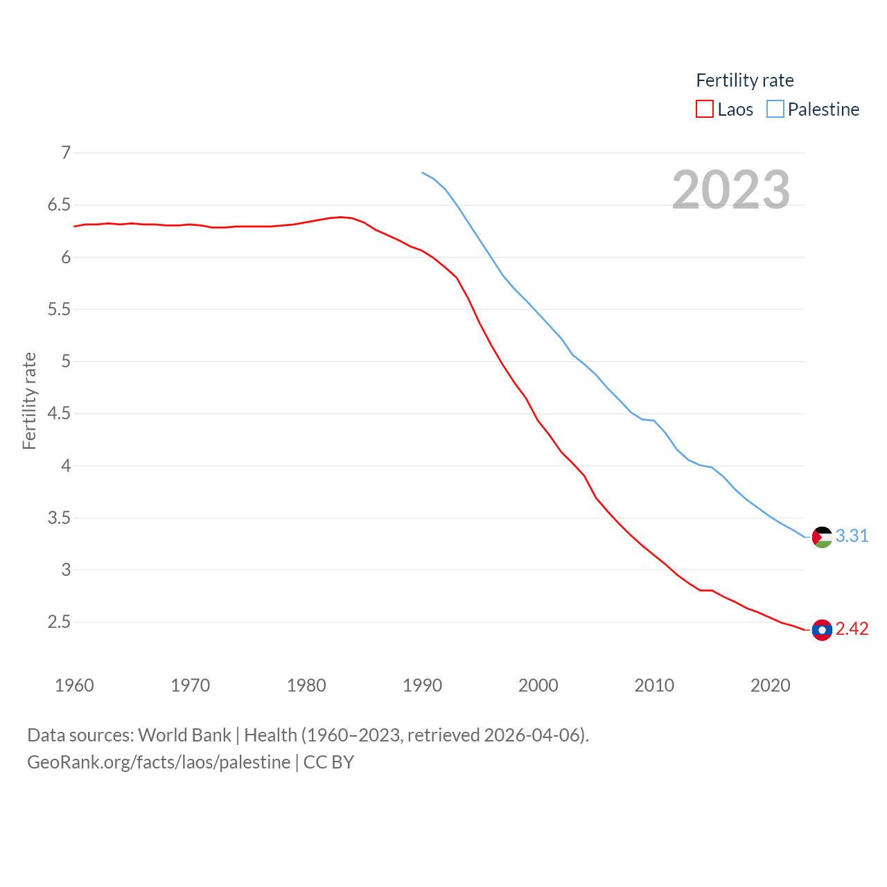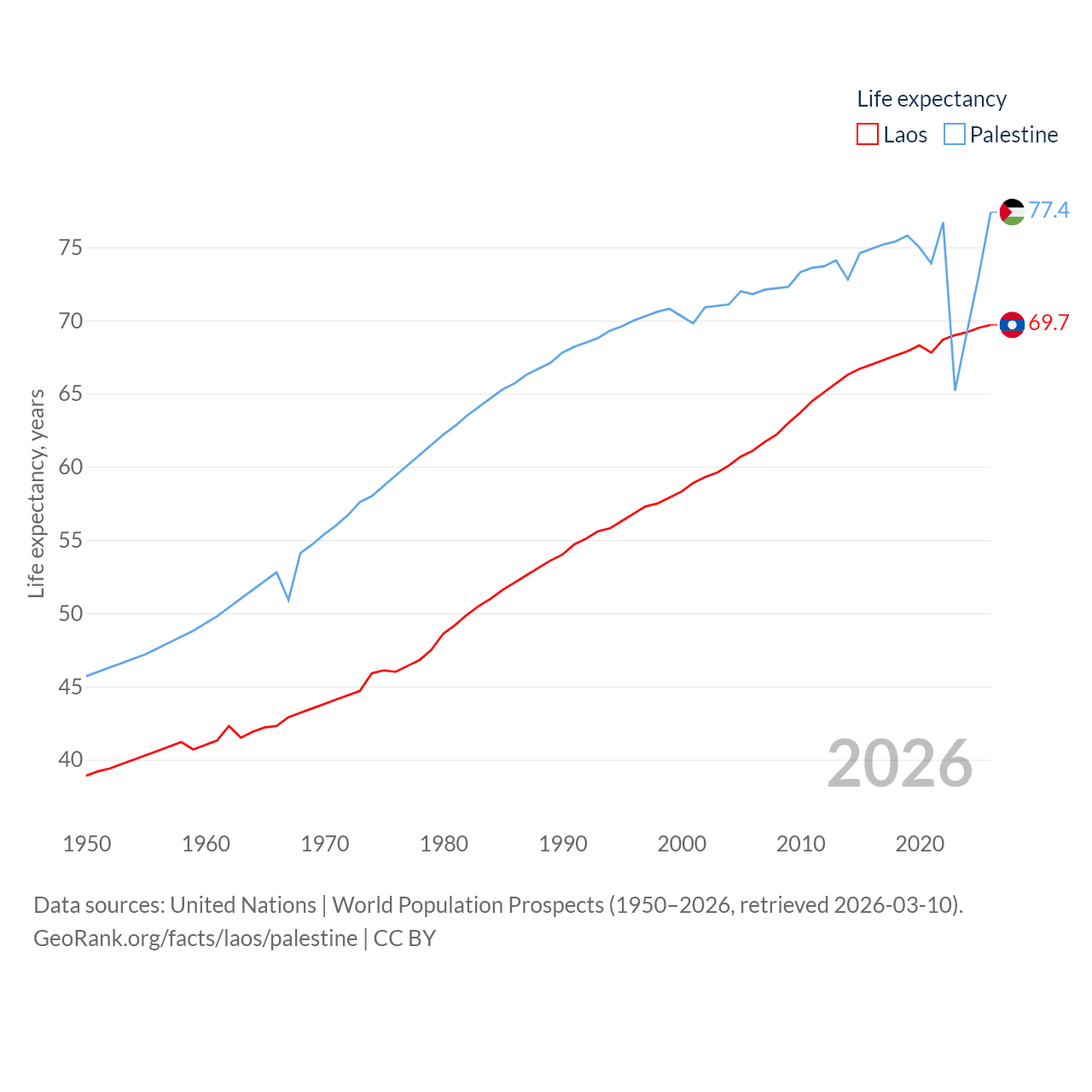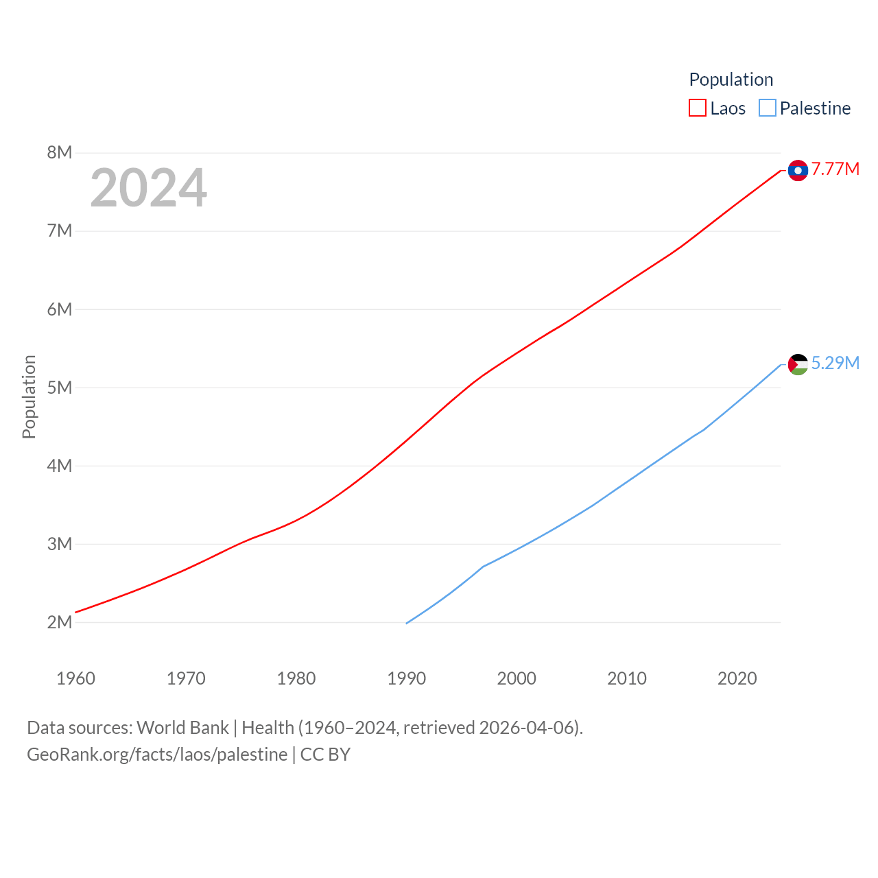 Laos has a population of 7.77M (ranked 103/197), compared with 5.29M in Palestine (ranked 122/197). Laos' land area is 89,112 sq mi versus 2,326 sq mi for Palestine (ranked 79th vs. 164th).