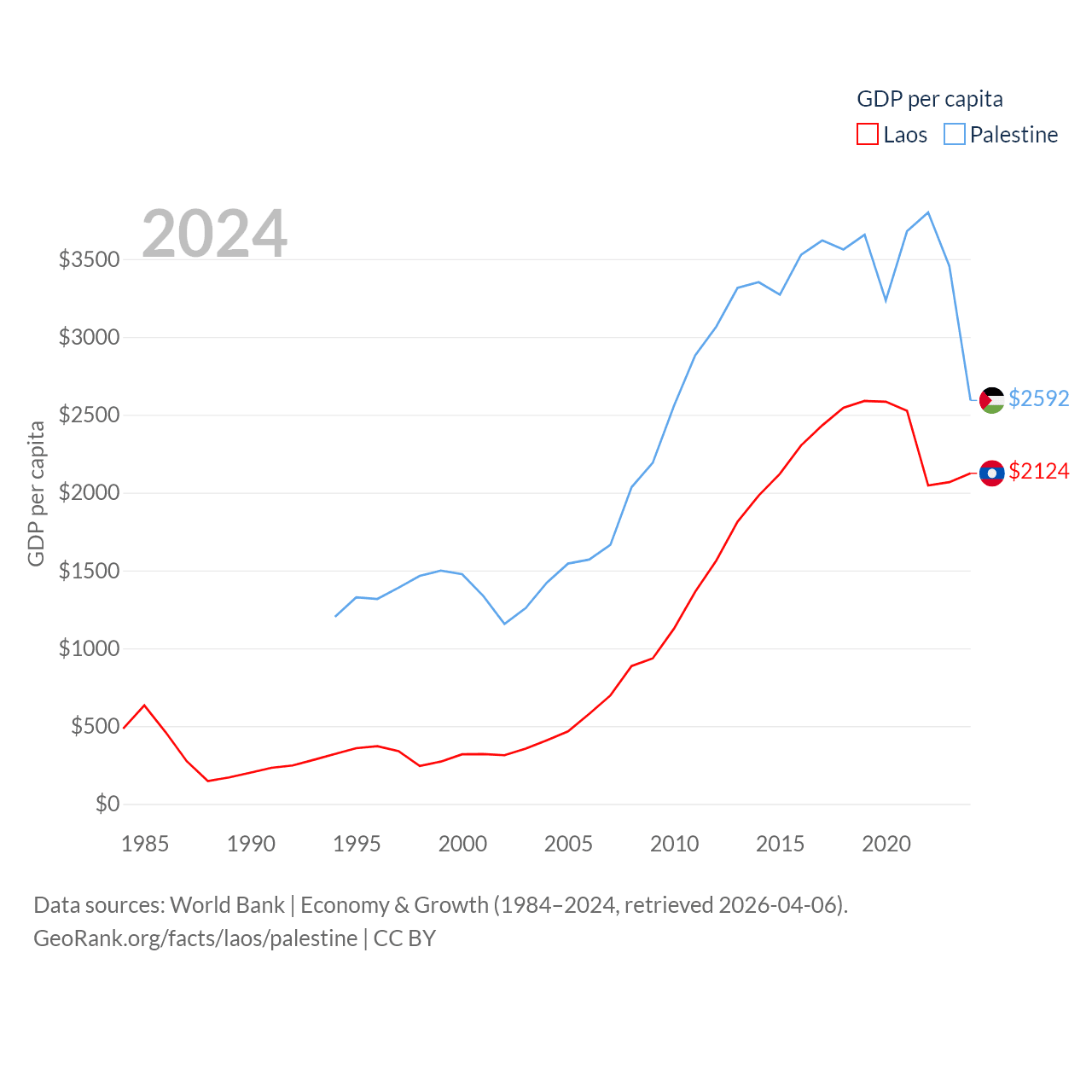 By GDP, Laos ranks 139/197 ($16.5B) and Palestine ranks 146/197 ($13.7B). By GDP per capita, Laos ranks 155/197 ($2,124), while Palestine ranks 147/197 ($2,592).