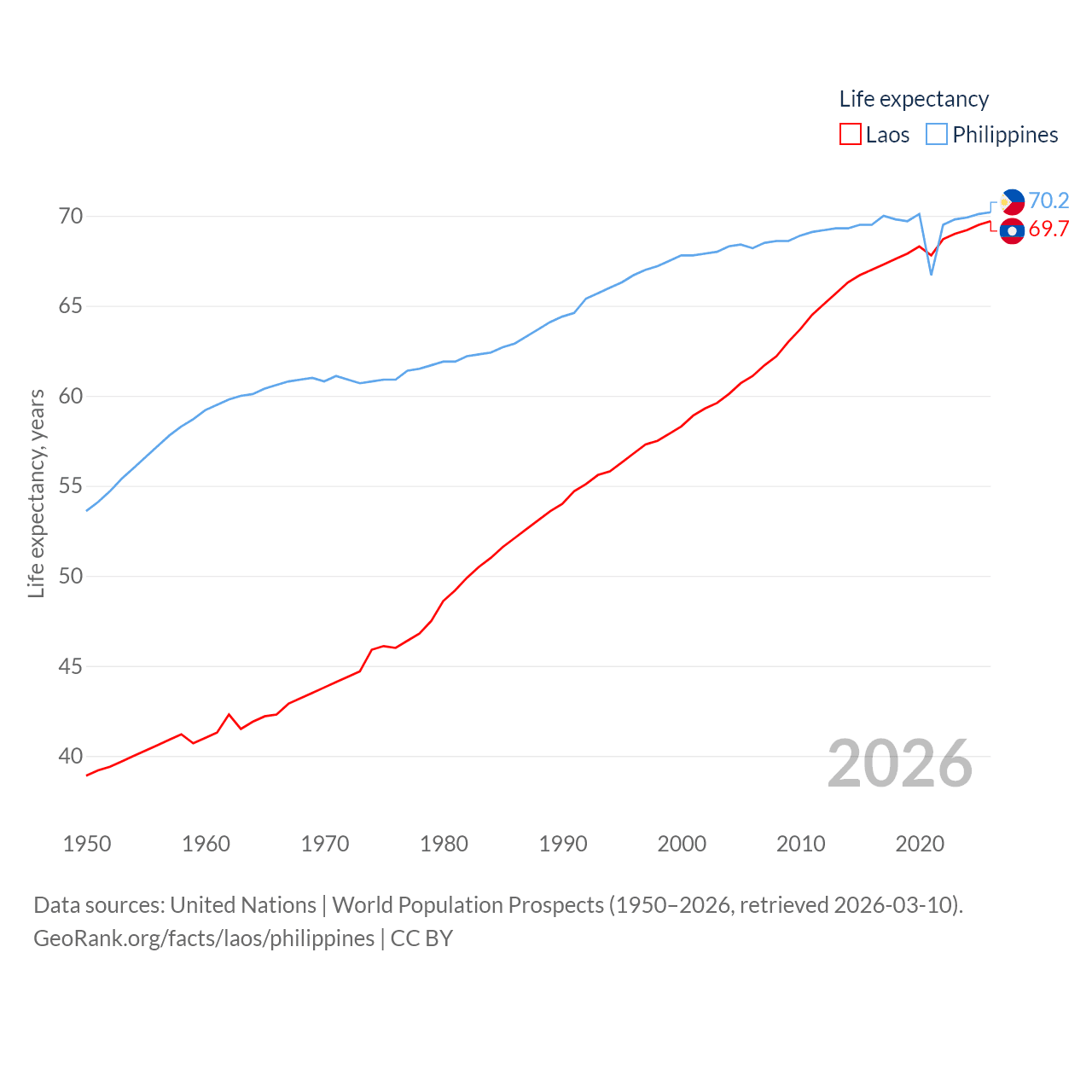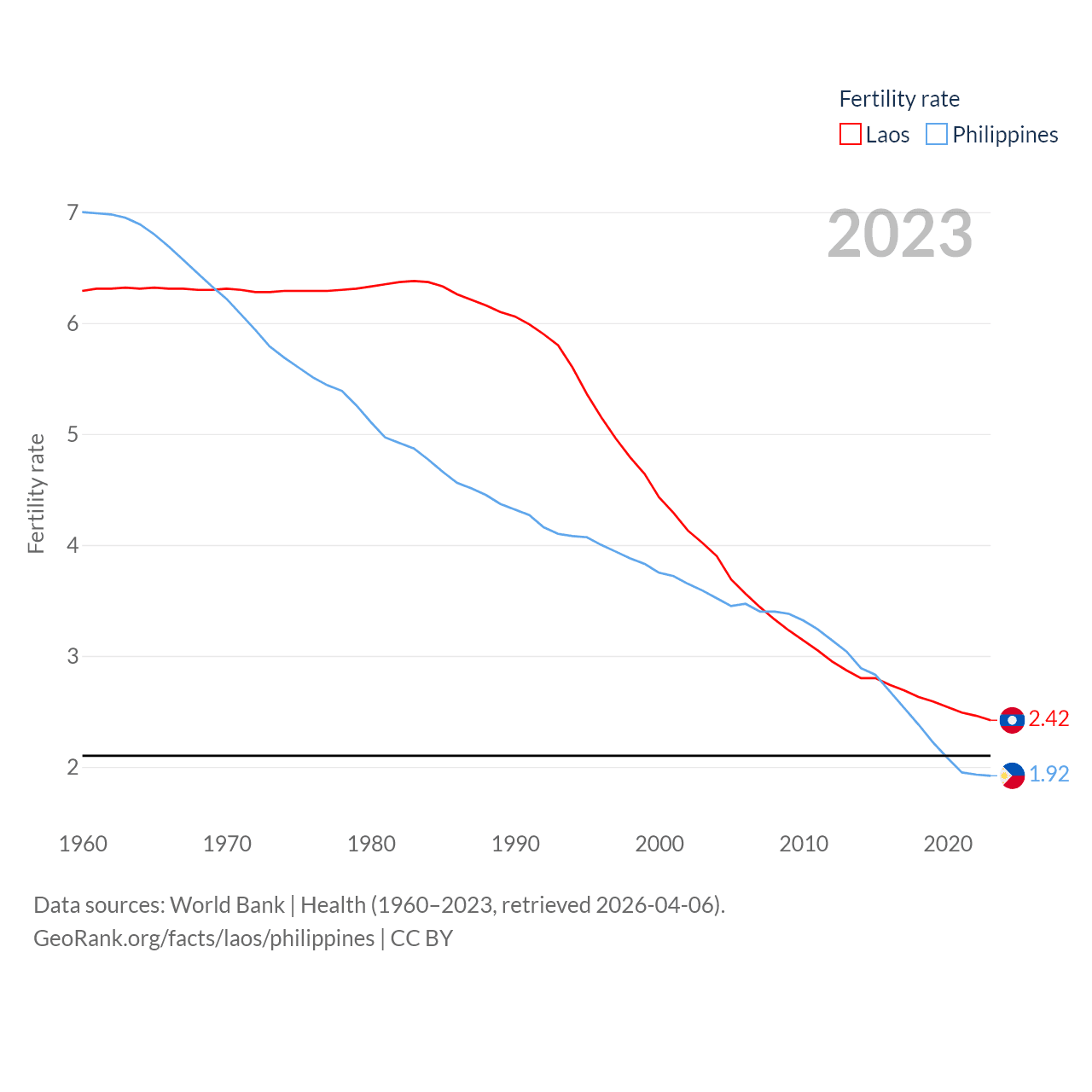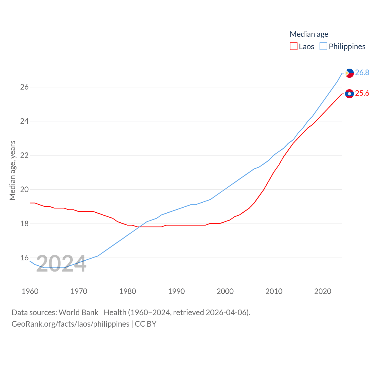Laos has a population of 7.77M (ranked 103/197), compared with 116M in The Philippines (ranked 14/197). Laos' land area is 89,112 sq mi versus 115,124 sq mi for The Philippines (ranked 79th vs. 71st).