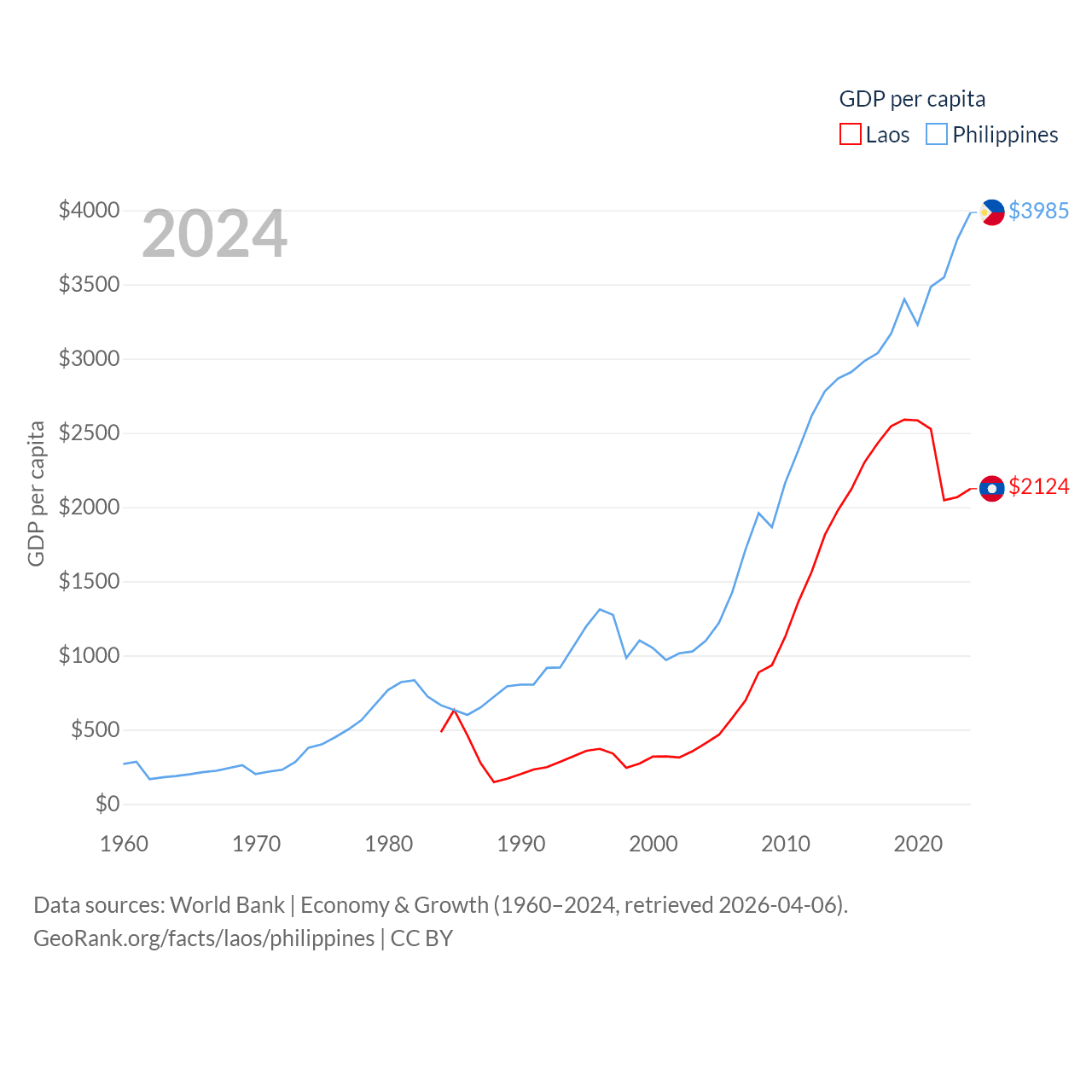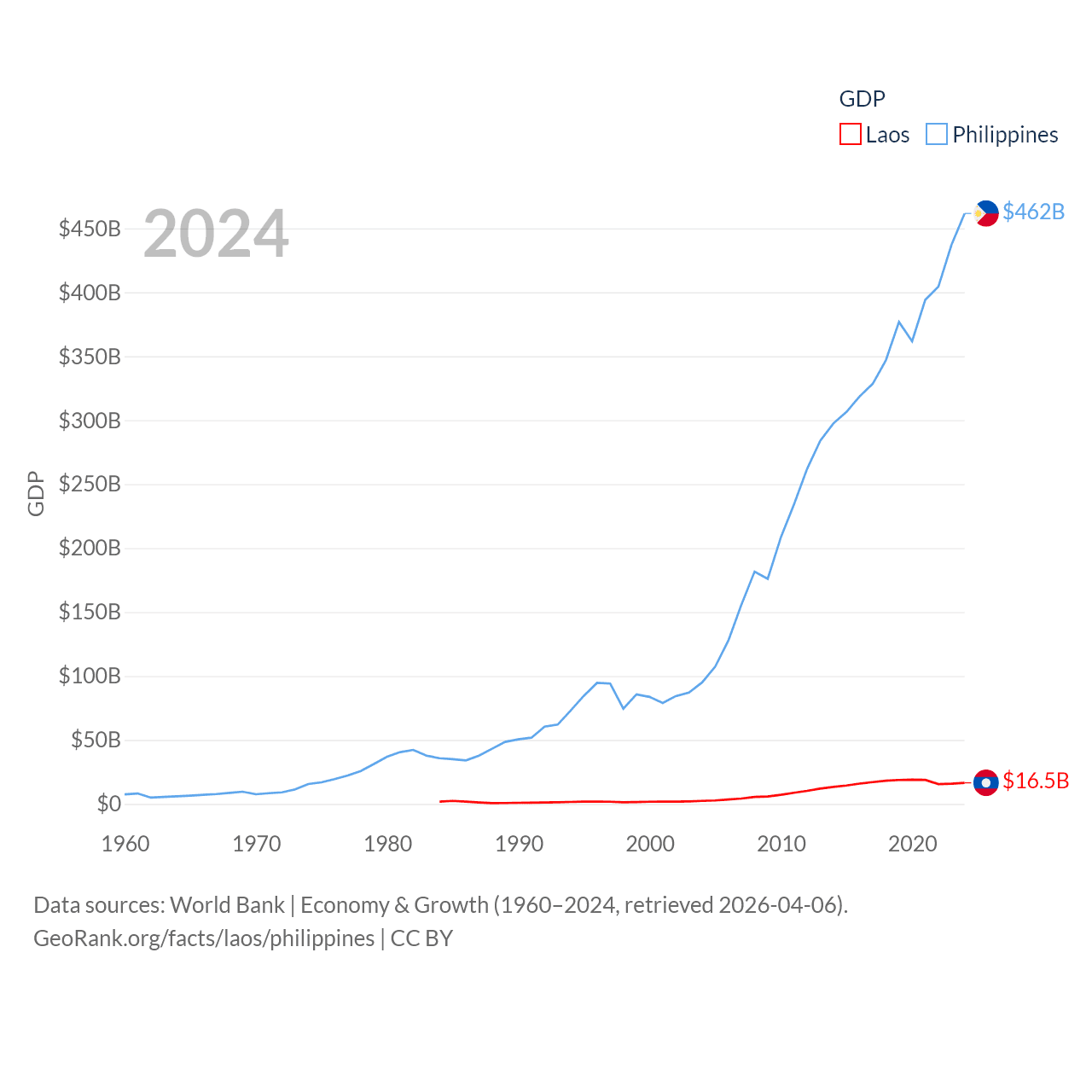 By GDP, Laos ranks 139/197 ($16.5B) and The Philippines ranks 35/197 ($462B). By GDP per capita, Laos ranks 155/197 ($2,124), while The Philippines ranks 130/197 ($3,985).
