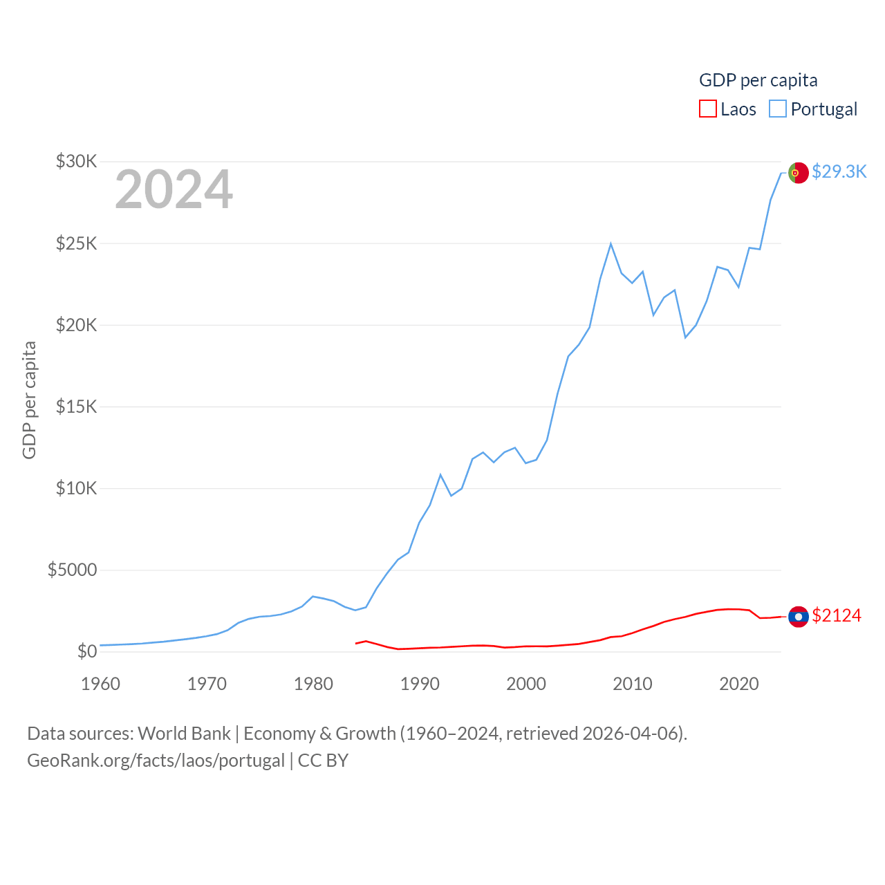 By GDP, Laos ranks 139/197 ($16.5B) and Portugal ranks 46/197 ($313B). By GDP per capita, Laos ranks 155/197 ($2,124), while Portugal ranks 44/197 ($29,292).