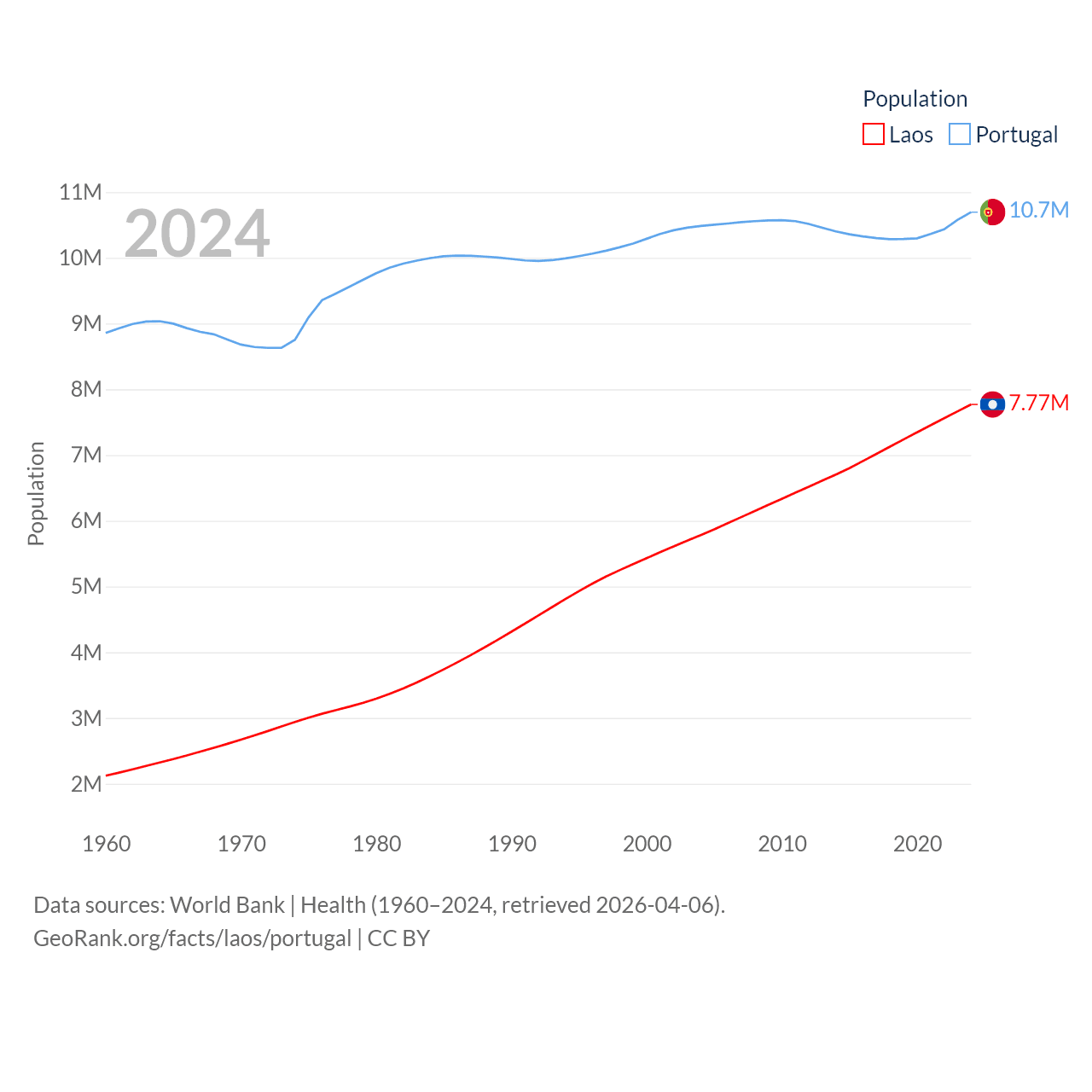 Laos has a population of 7.77M (ranked 103/197), compared with 10.7M in Portugal (ranked 90/197). Laos' land area is 89,112 sq mi versus 35,369 sq mi for Portugal (ranked 79th vs. 108th).