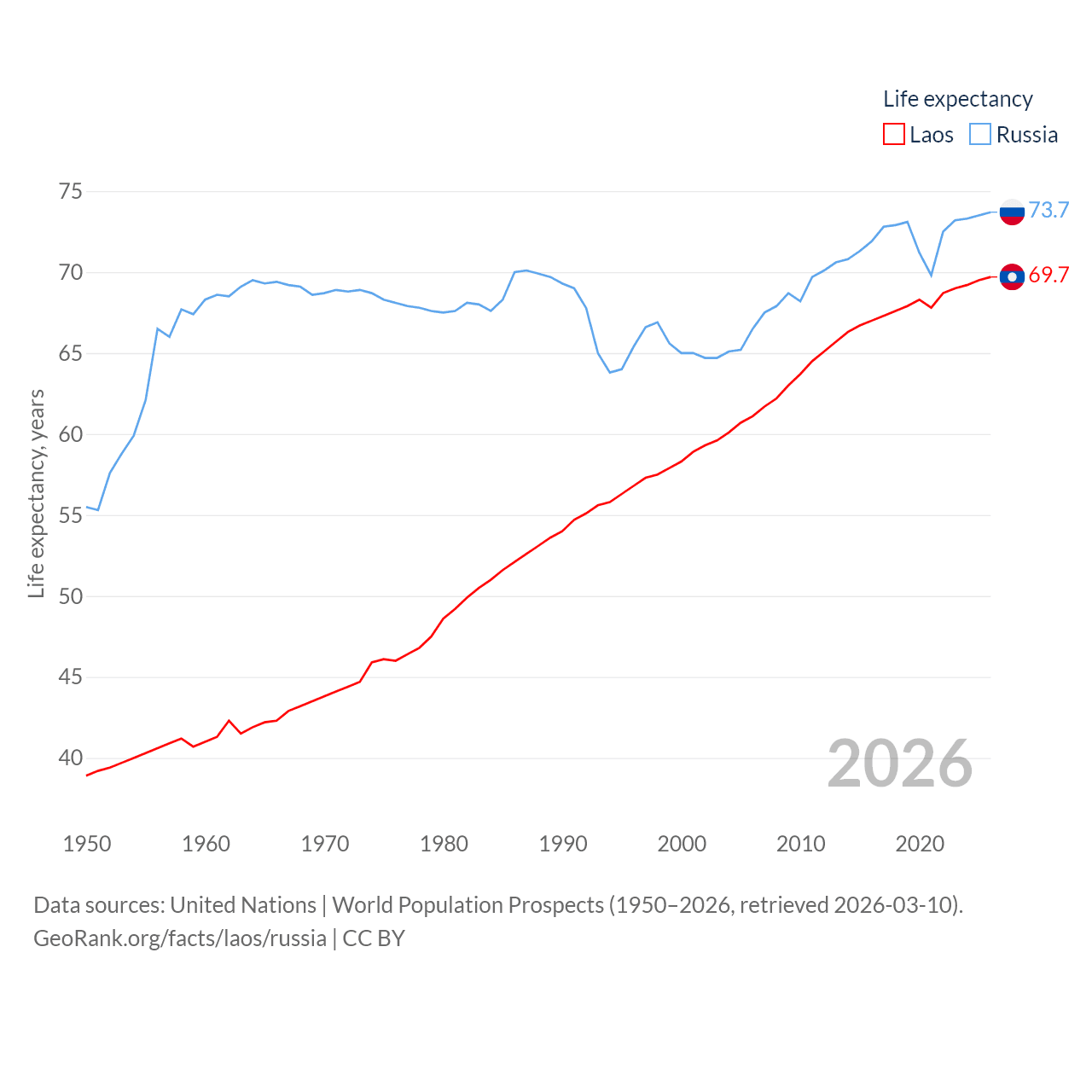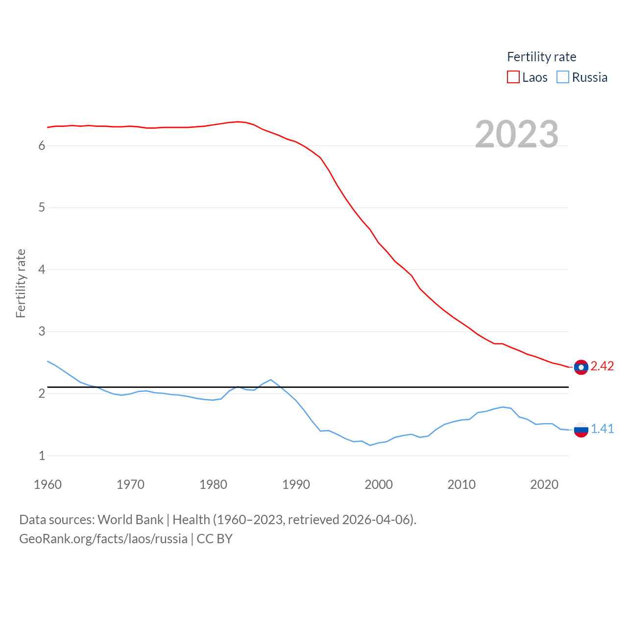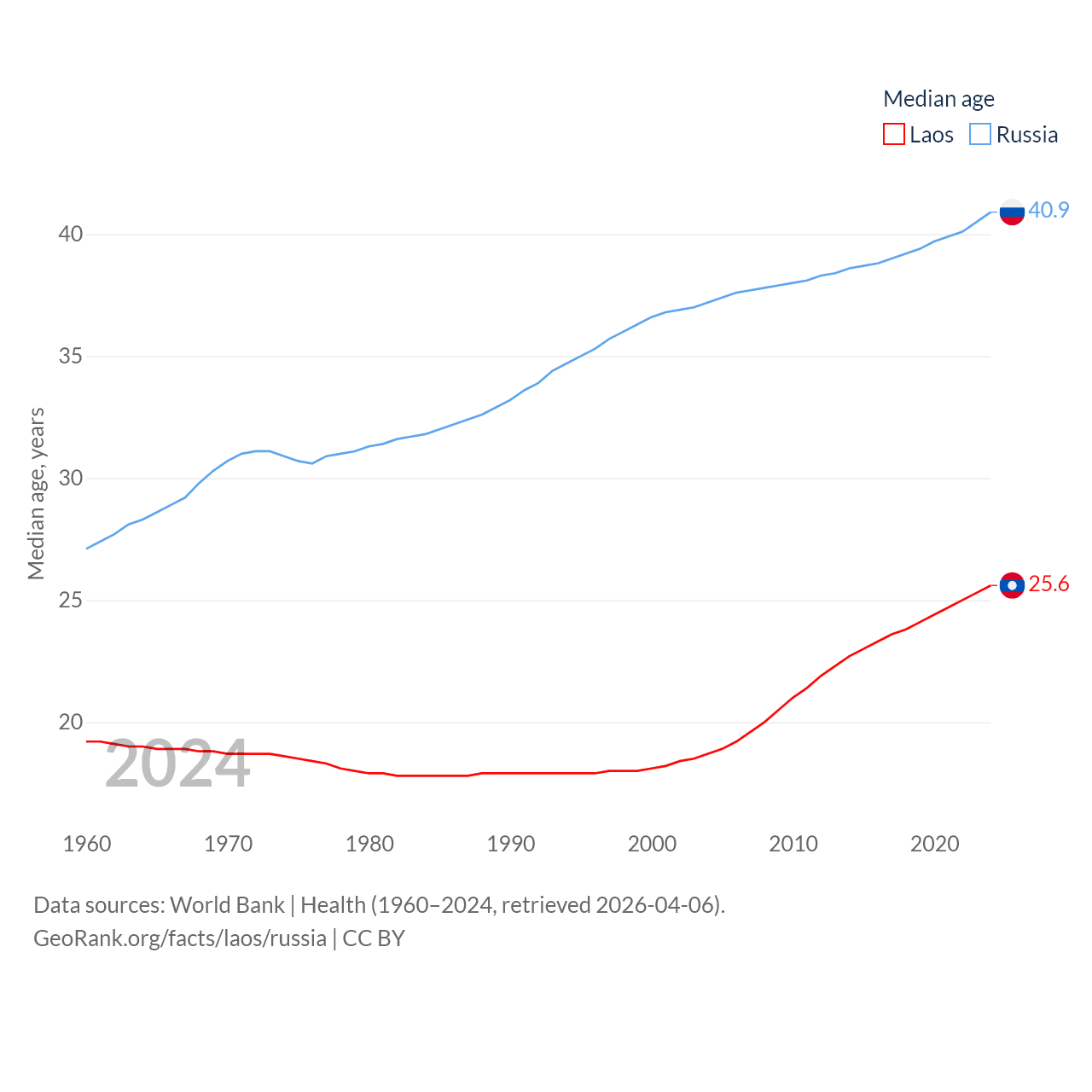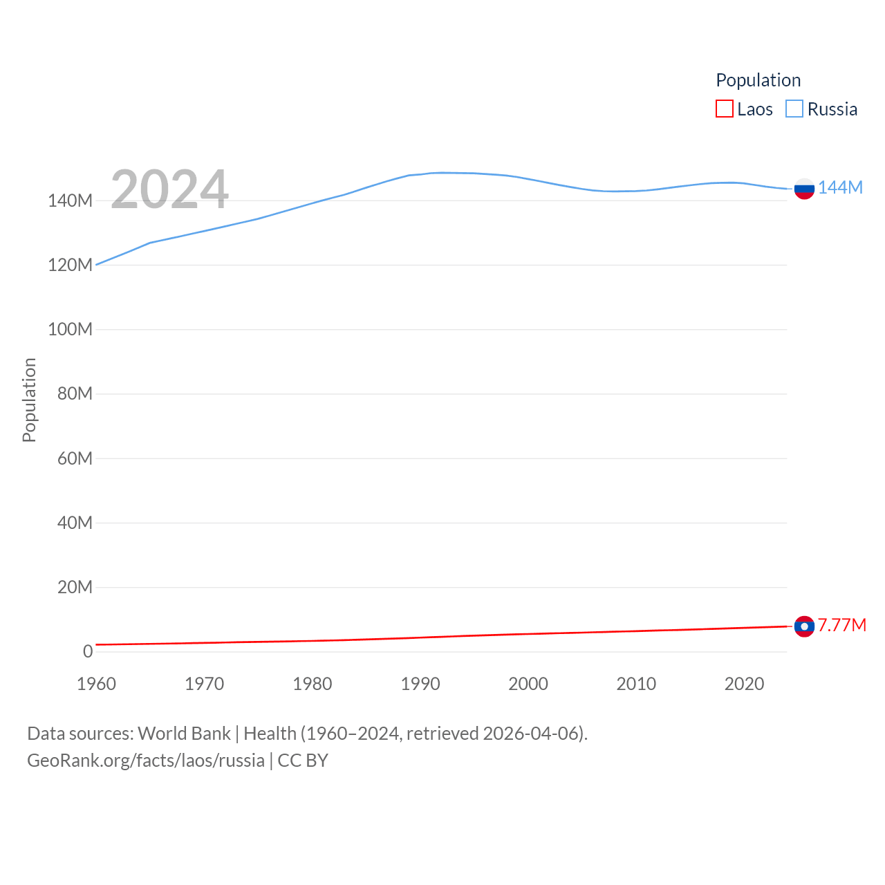 Laos has a population of 7.77M (ranked 103/197), compared with 144M in Russia (ranked 9/197). Laos' land area is 89,112 sq mi versus 6,323,145 sq mi for Russia (ranked 79th vs. 1st).