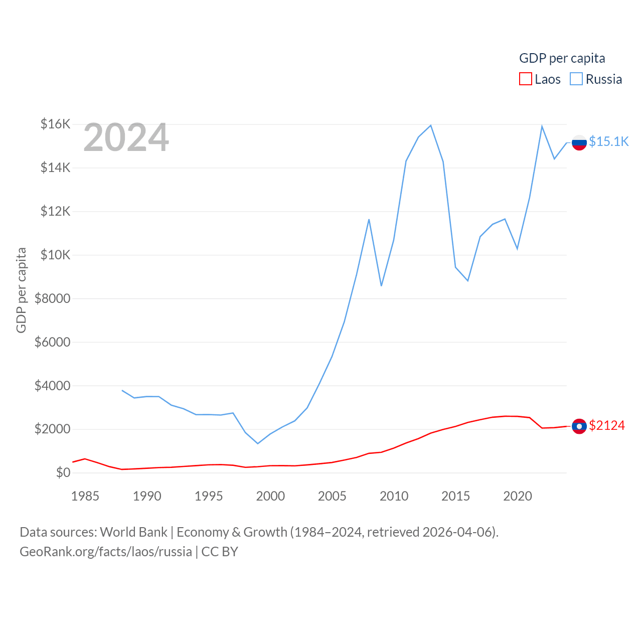By GDP, Laos ranks 139/197 ($16.5B) and Russia ranks 11/197 ($2.17T). By GDP per capita, Laos ranks 155/197 ($2,124), while Russia ranks 68/197 ($15,145).