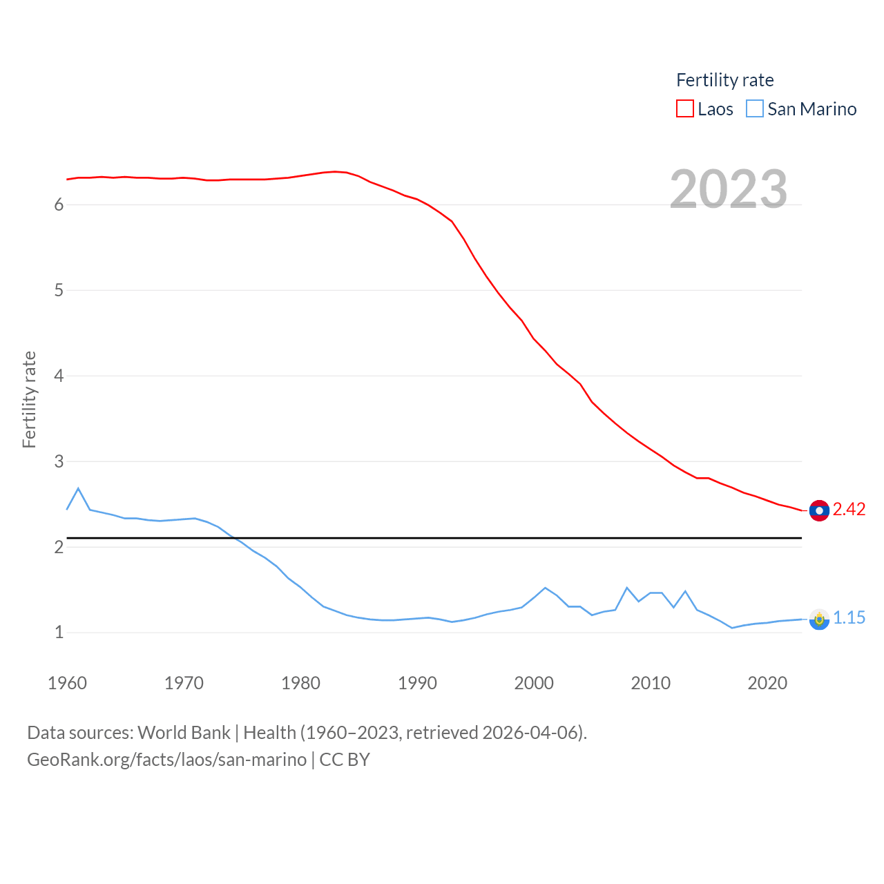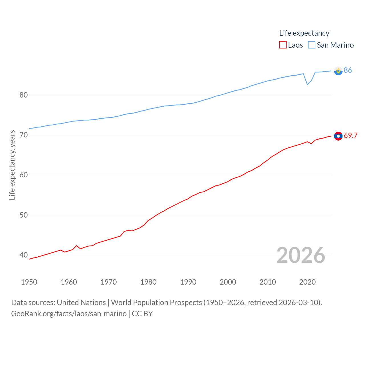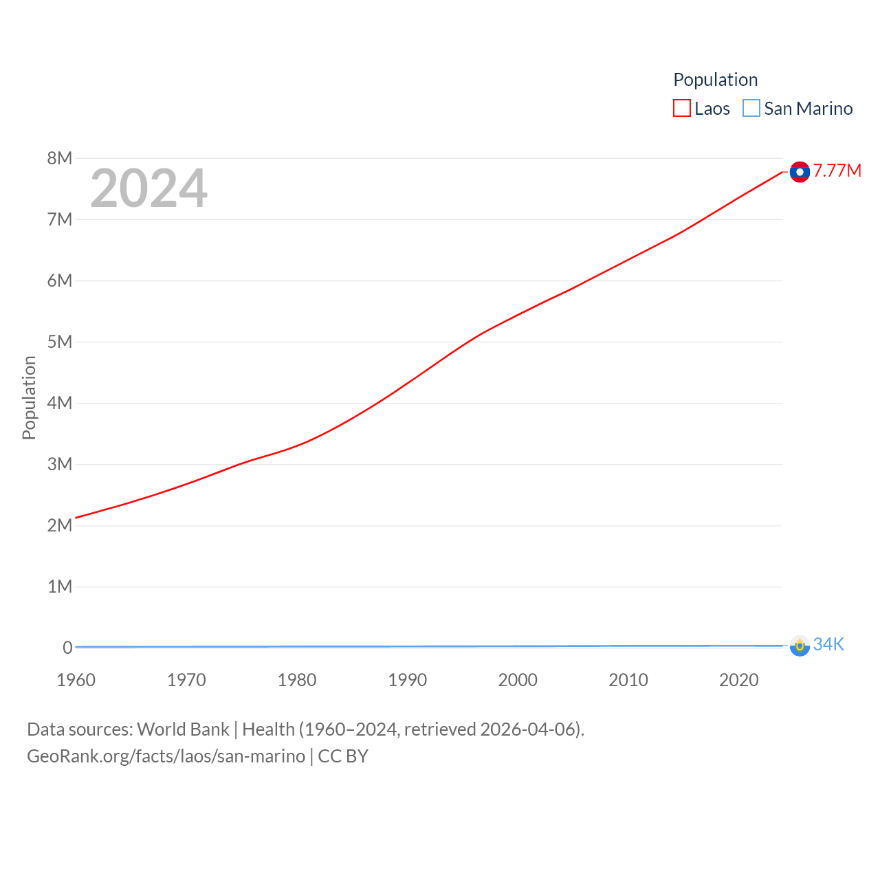 Laos has a population of 7.77M (ranked 103/197), compared with 34K in San Marino (ranked 193/197). Laos' land area is 89,112 sq mi versus 23.2 sq mi for San Marino (ranked 79th vs. 193rd).