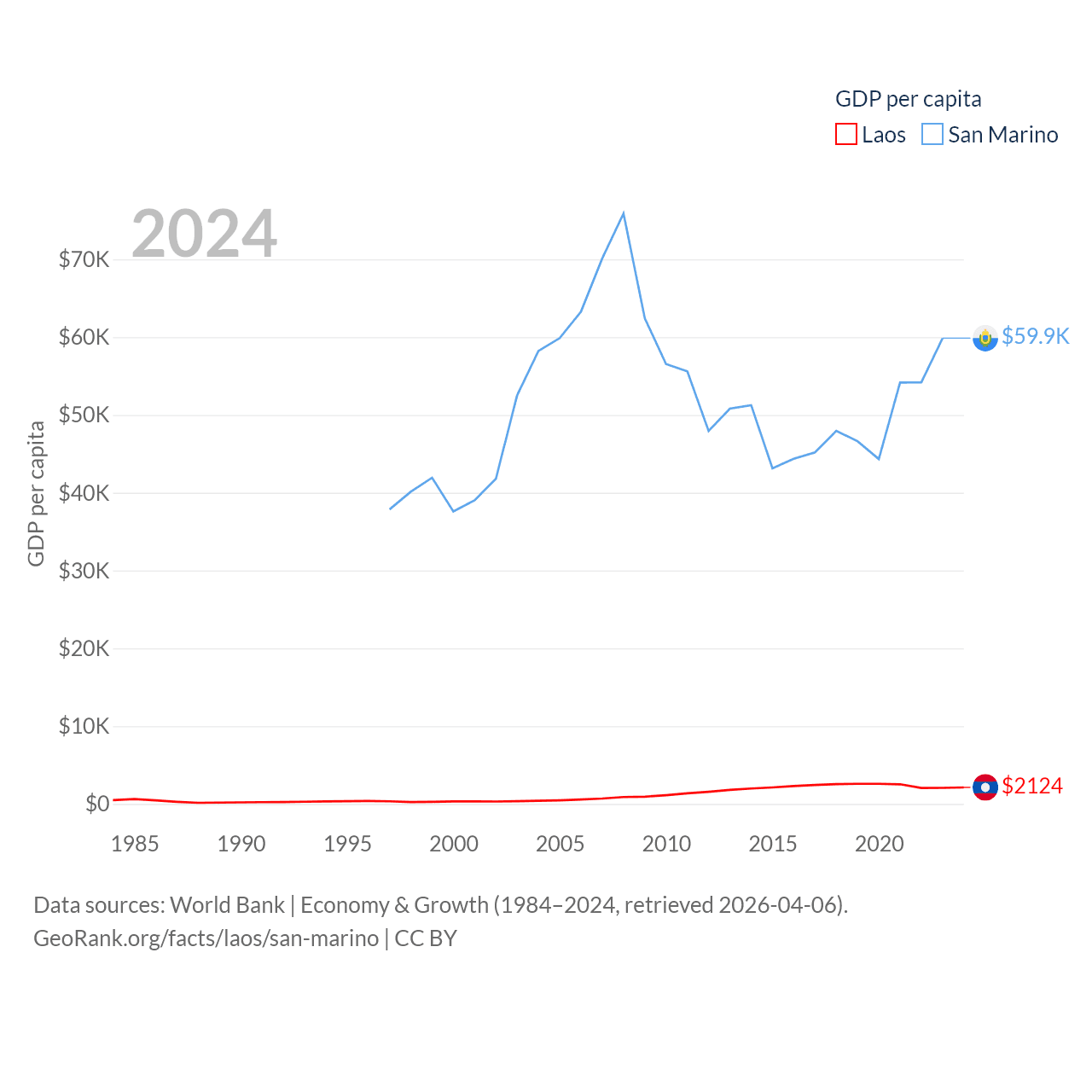 By GDP, Laos ranks 139/197 ($16.5B) and San Marino ranks 180/197 ($2.03B). By GDP per capita, Laos ranks 155/197 ($2,124), while San Marino ranks 15/197 ($59,880).